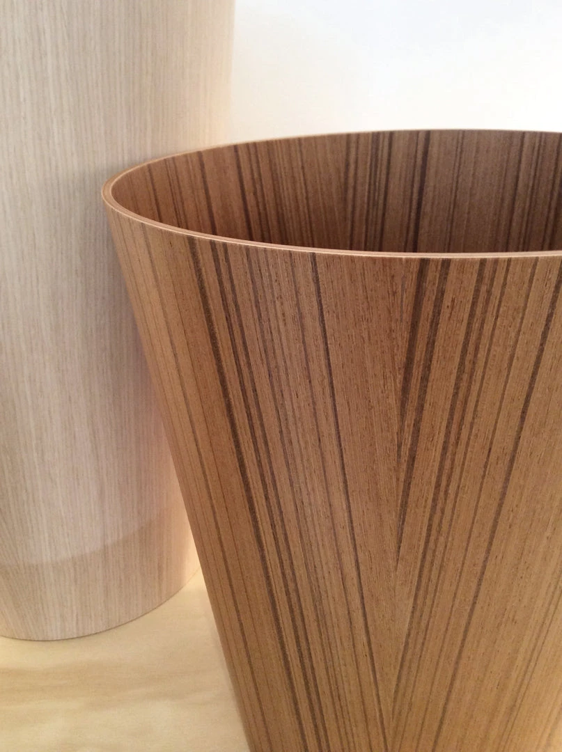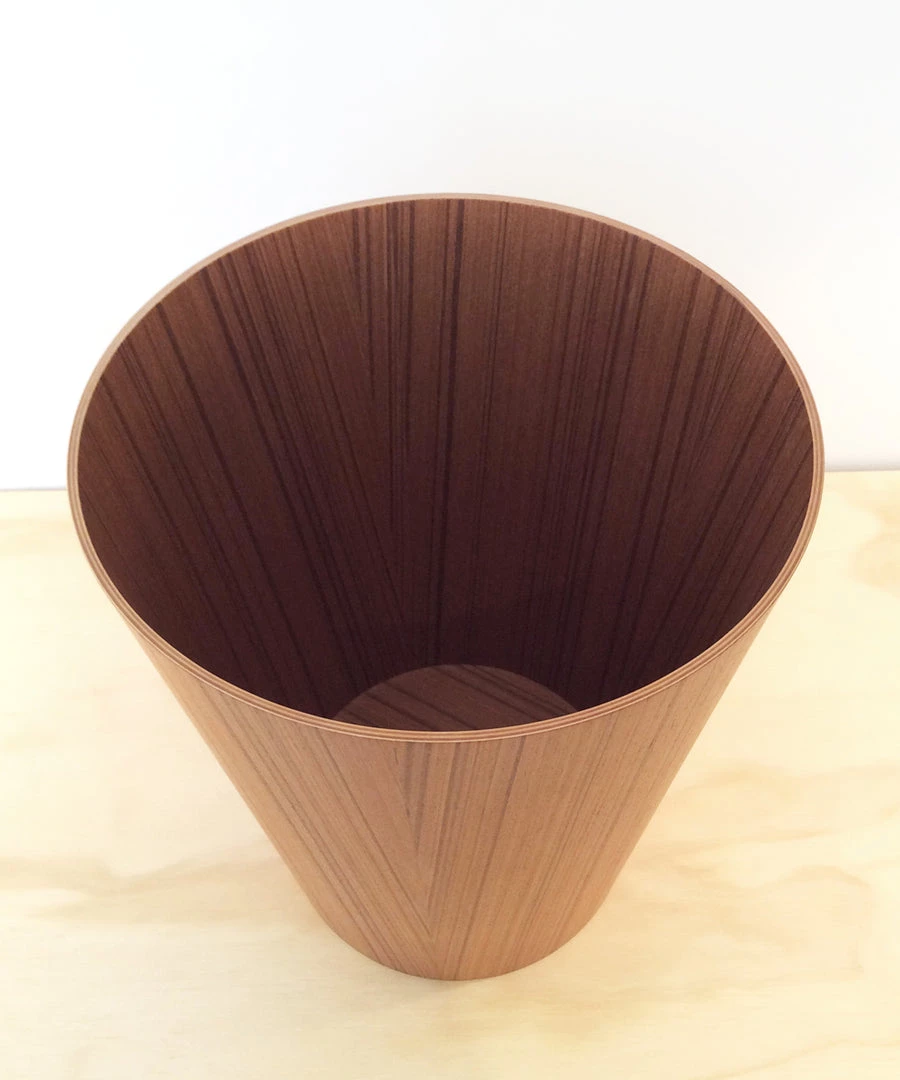 The every day wastebasket trash bin as modern, simple and beautiful. Made of African Ayous wood, layered and stained in graduated shades to resemble teak grain. Created by Saito Wood Co., a three-generation company producing well-crafted bent ply goods for the home & office. Made in Japan.