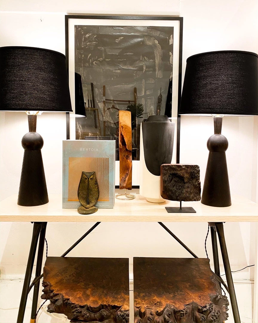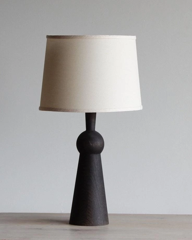 The Bella Skirt Lamp is an elegant design that adds warmth and character to any bedside table, credenza or desk. Made in solid oak with a cork bottom fitted to the base to protect surfaces. The lamp cord is a decorative brown twisted cloth wire and the plug is a round plug inspired by vintage bakelite. Choose a tapered fabric shade in black or ivory. Made in the USA.