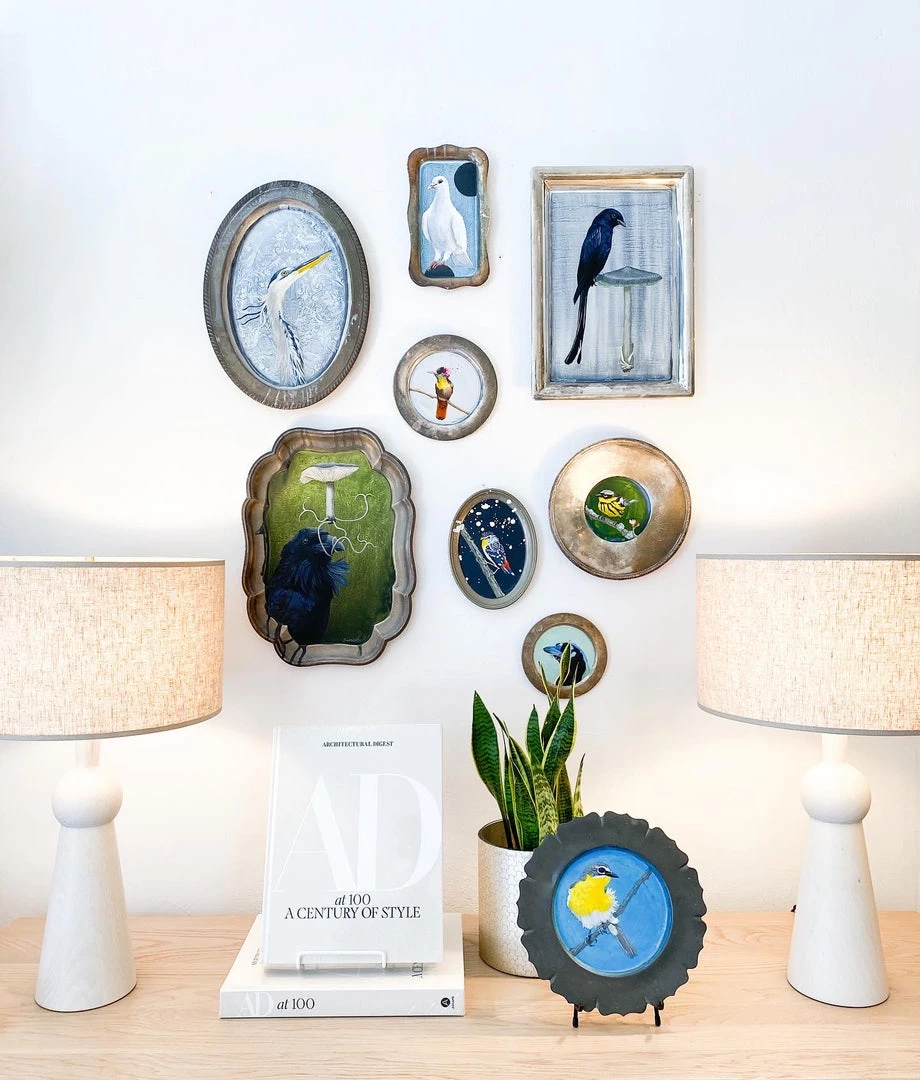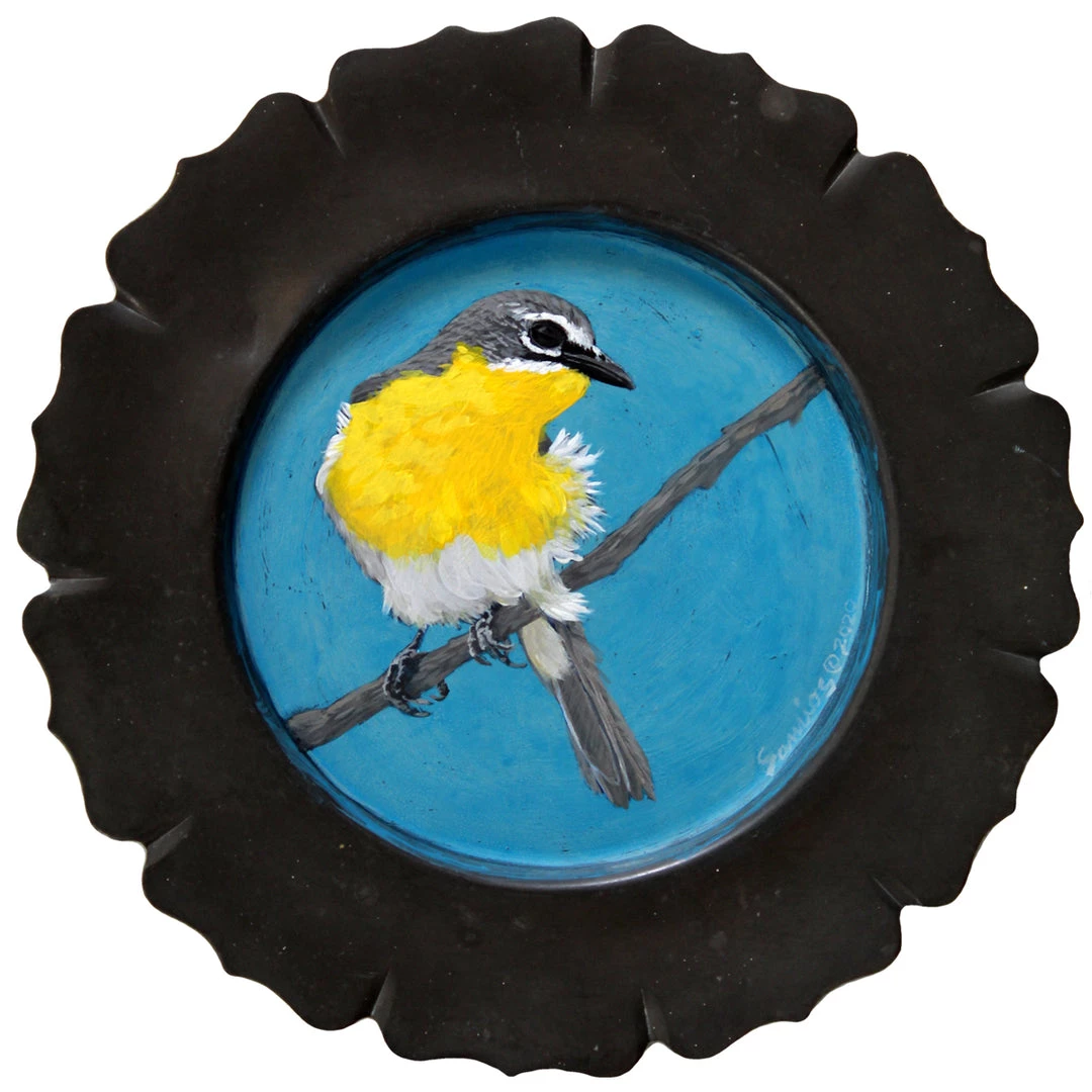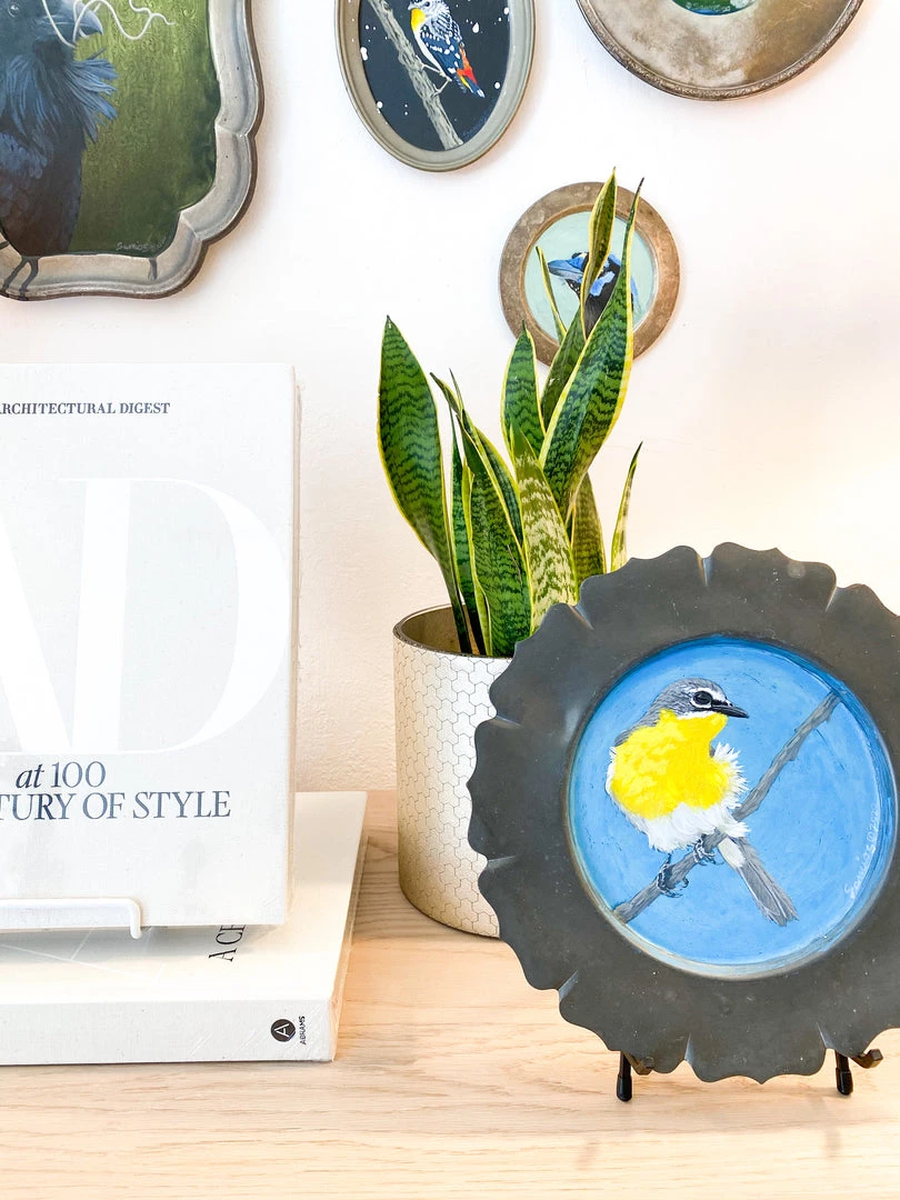 Outstanding original painting on a vintage silver tray of a Yellow Chat bird.