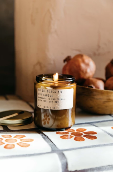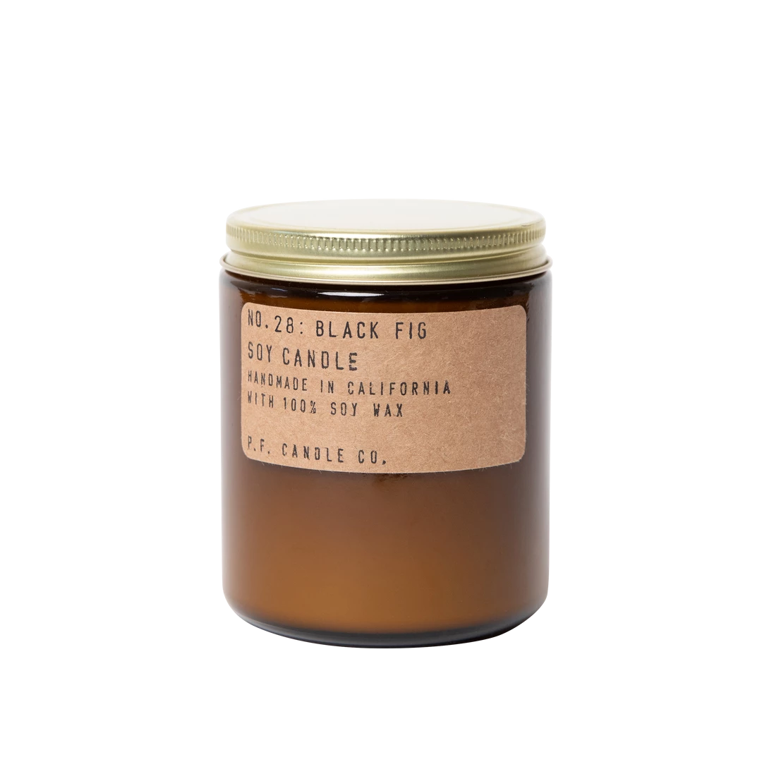 Made by P.F. Candle Company. Black Fig is available in the Small (7.2oz) size. Burn time of 40-50 hours. Hand poured into apothecary inspired jars.