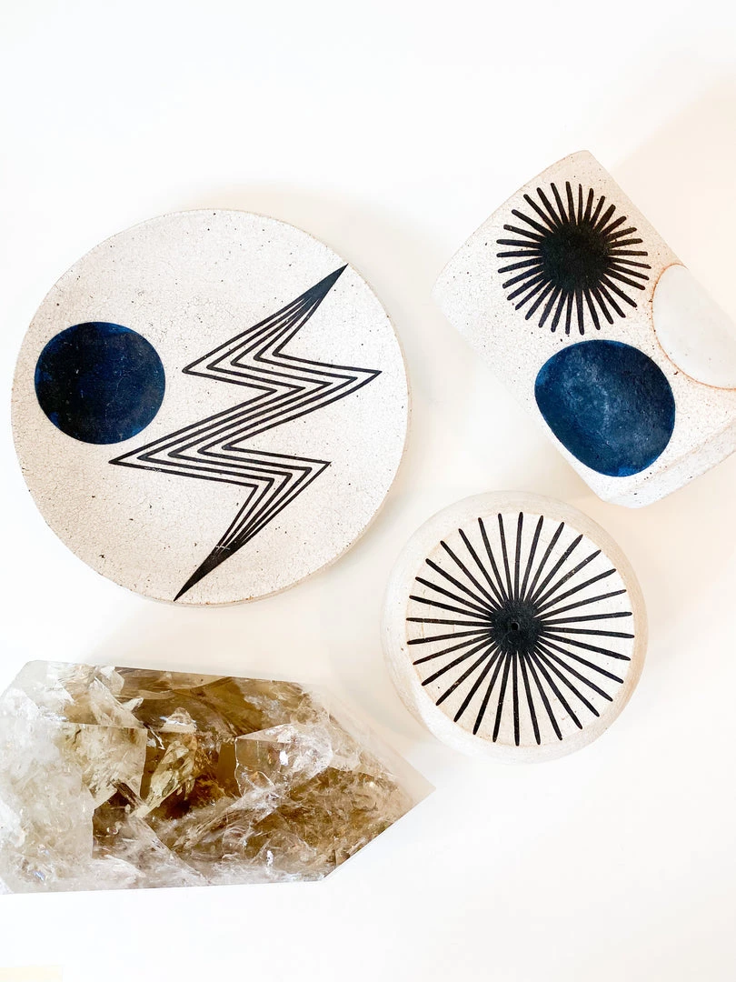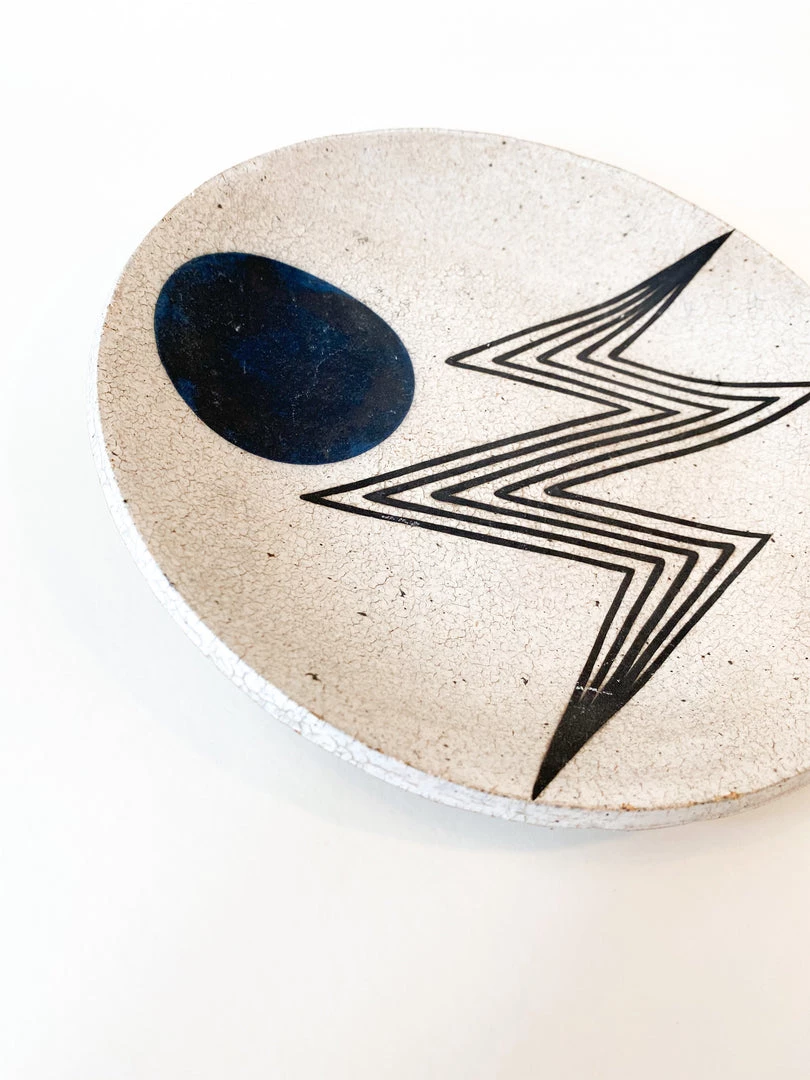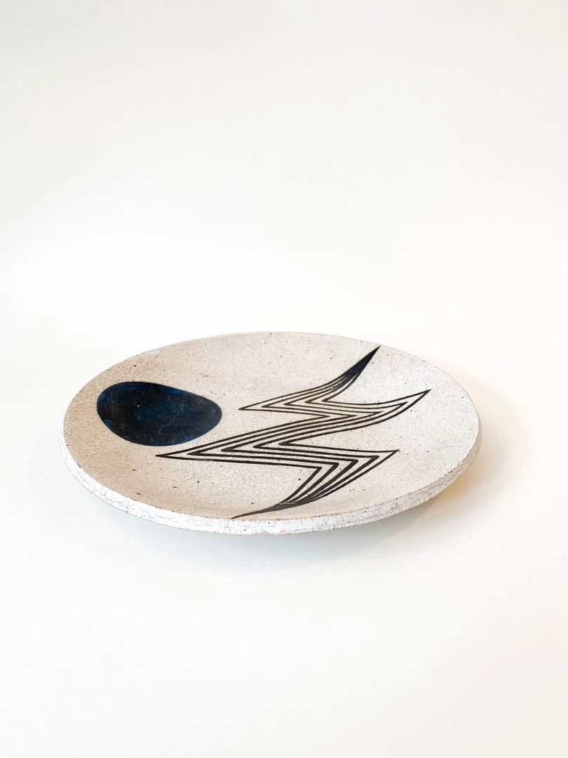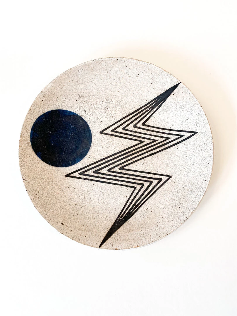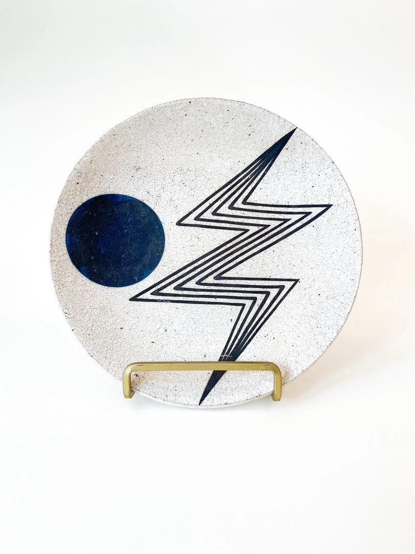 Ceramic handmade plate with outline of lightening bolt and indigo moon.Â