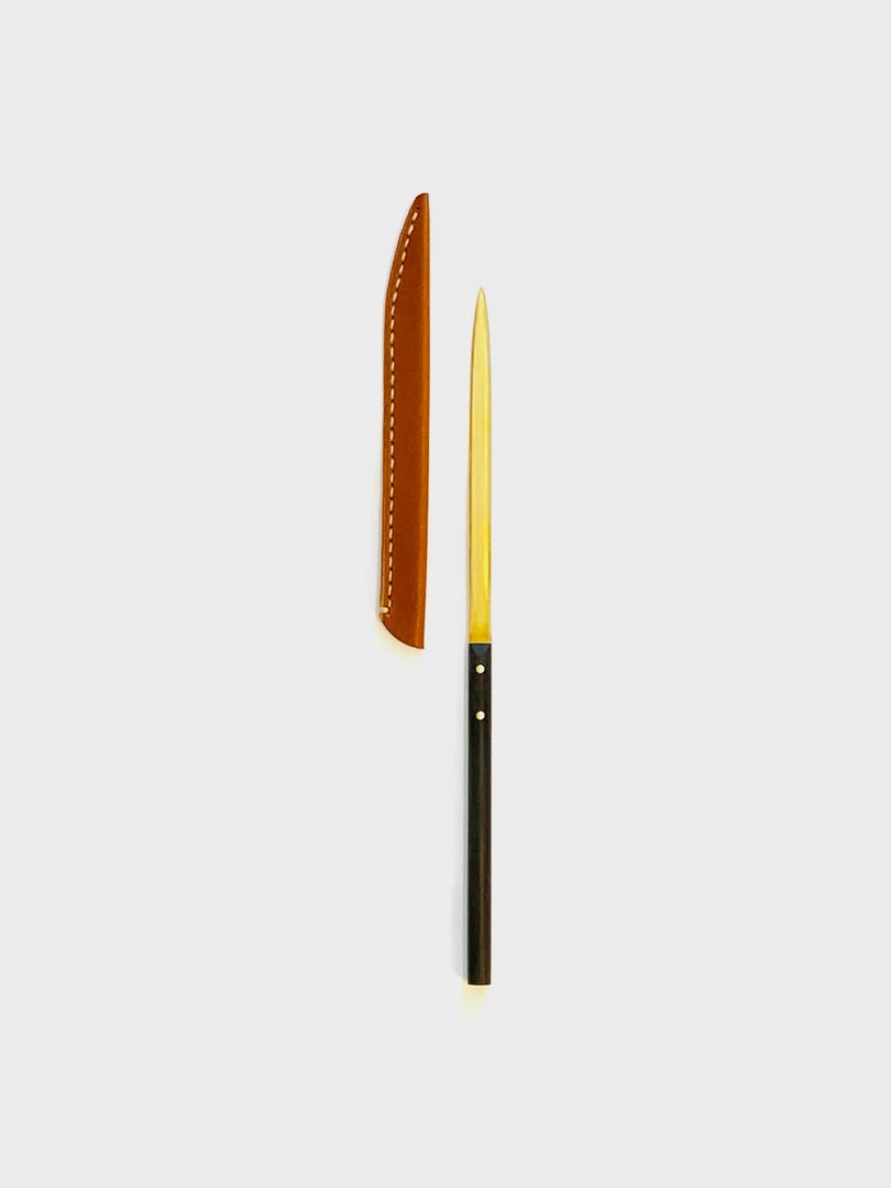 Beautifully crafted letter opener. Made of hand forged brass and wenge wood. The sheath is made of hand stitched bridle leather.Â