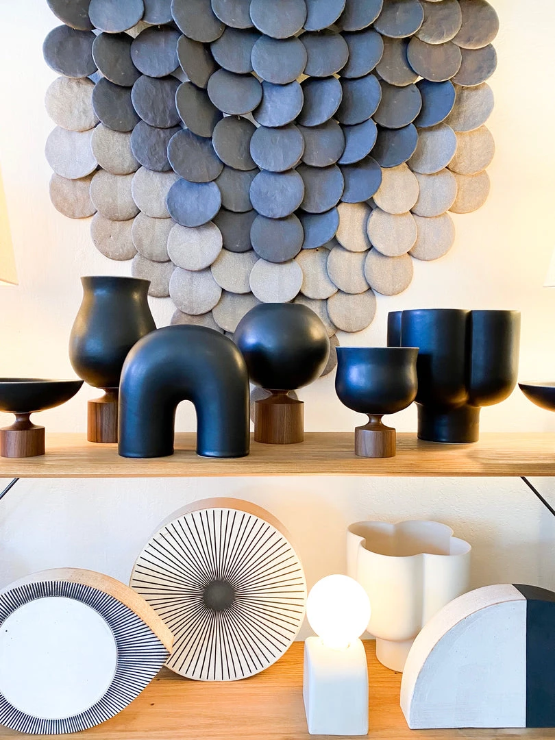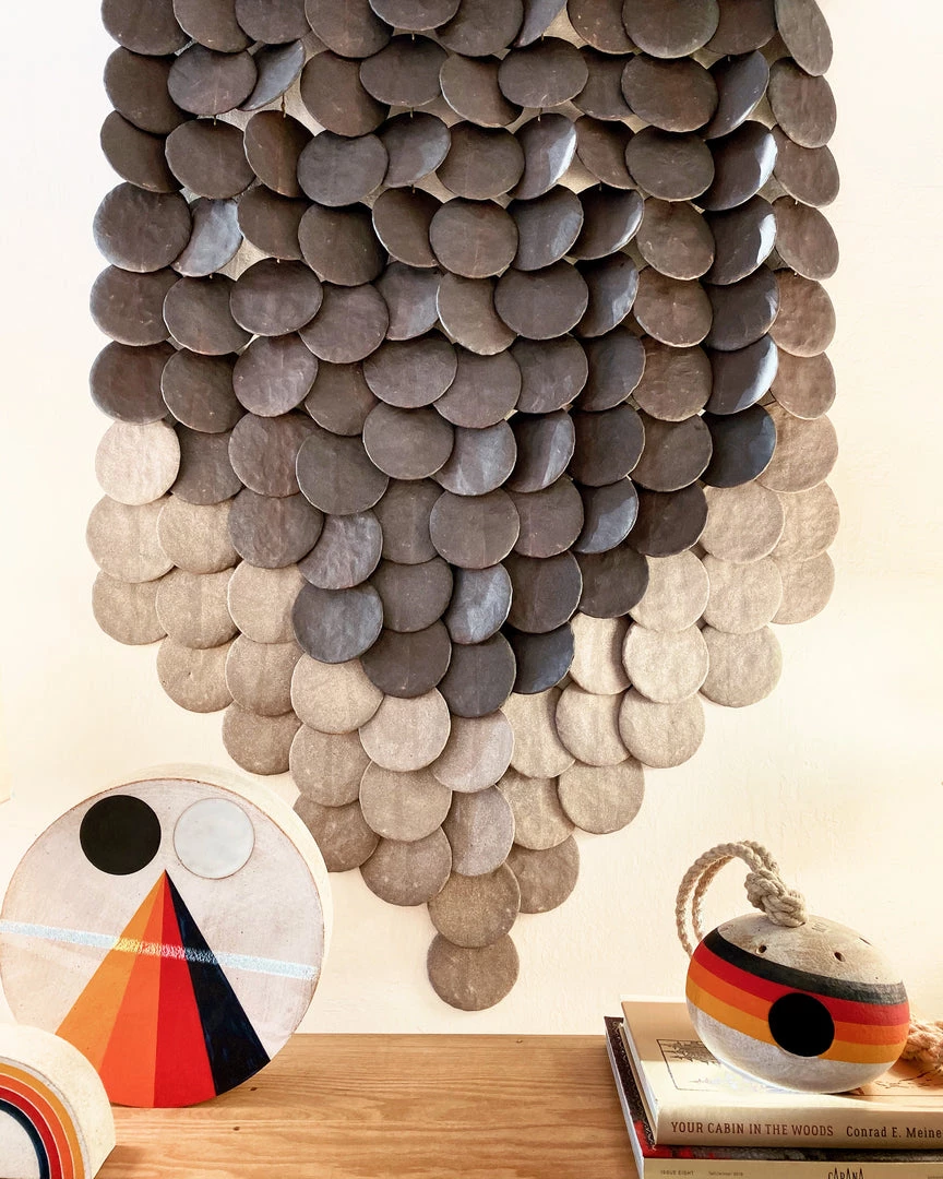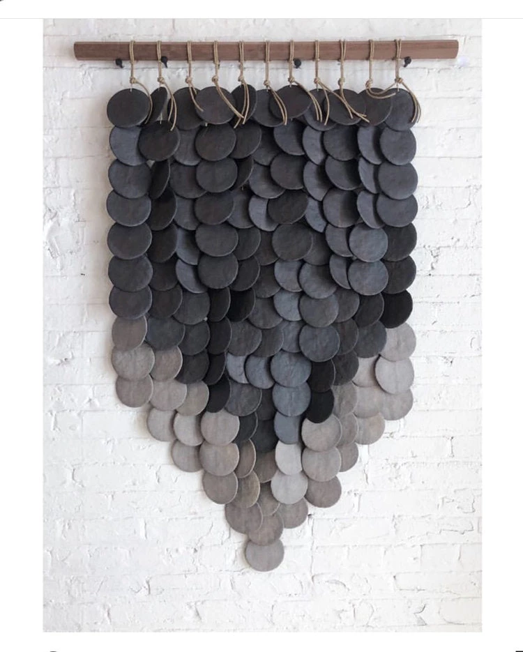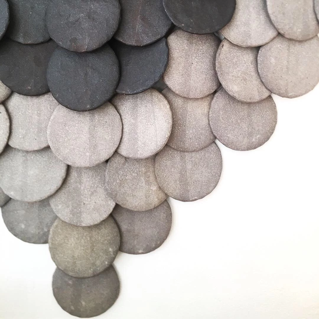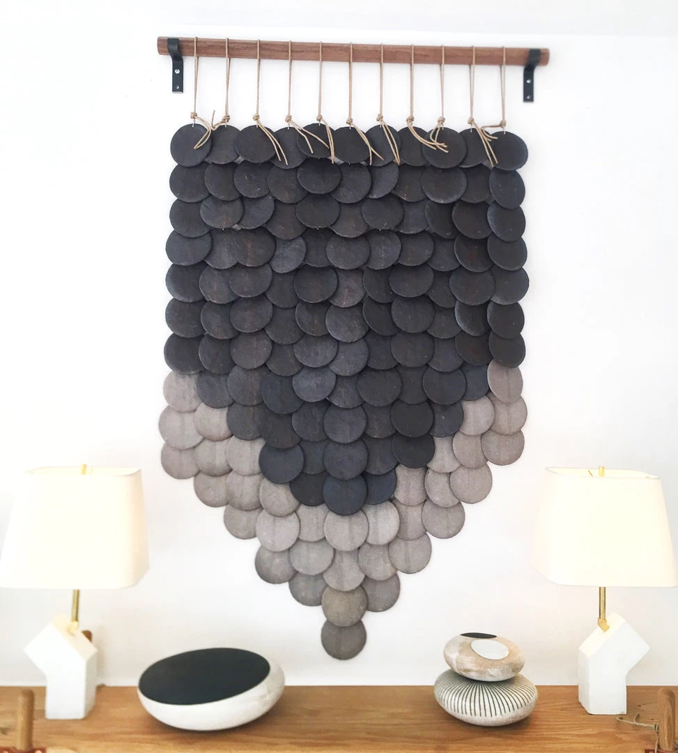 Incredible one of a kind large scale wall sculpture. Made from strands of ceramic discs in black and grey. Handmade in New York by MQuan – this spectacular piece was commissioned exclusively for Super Simple.