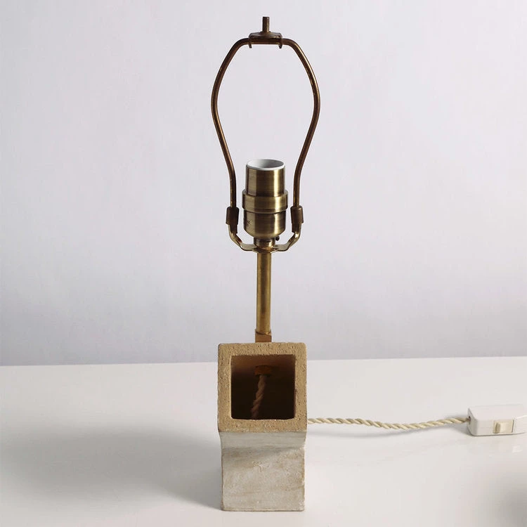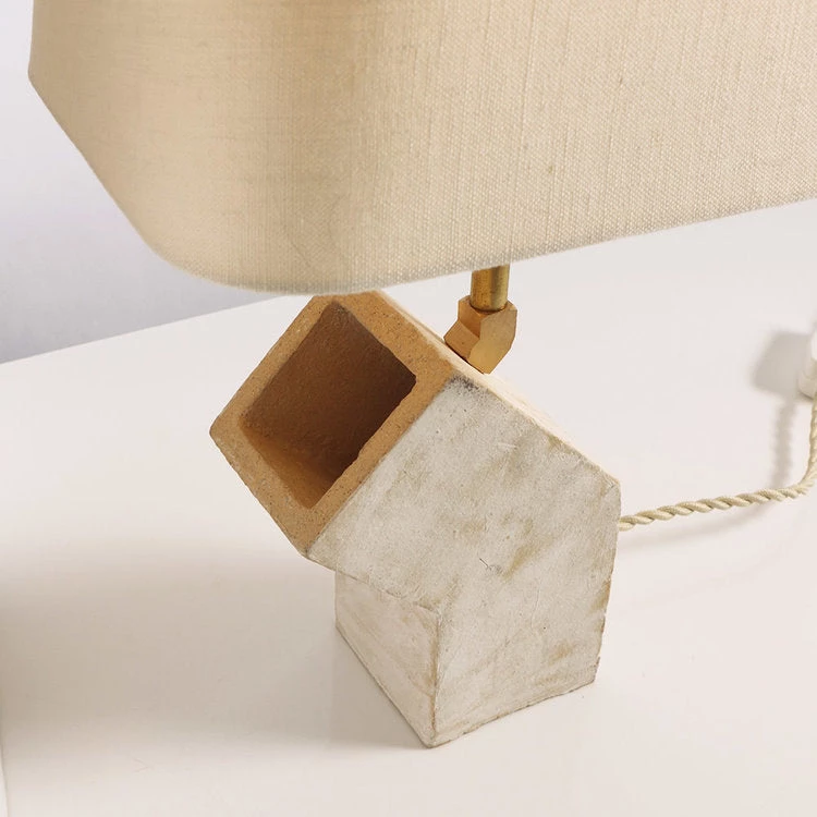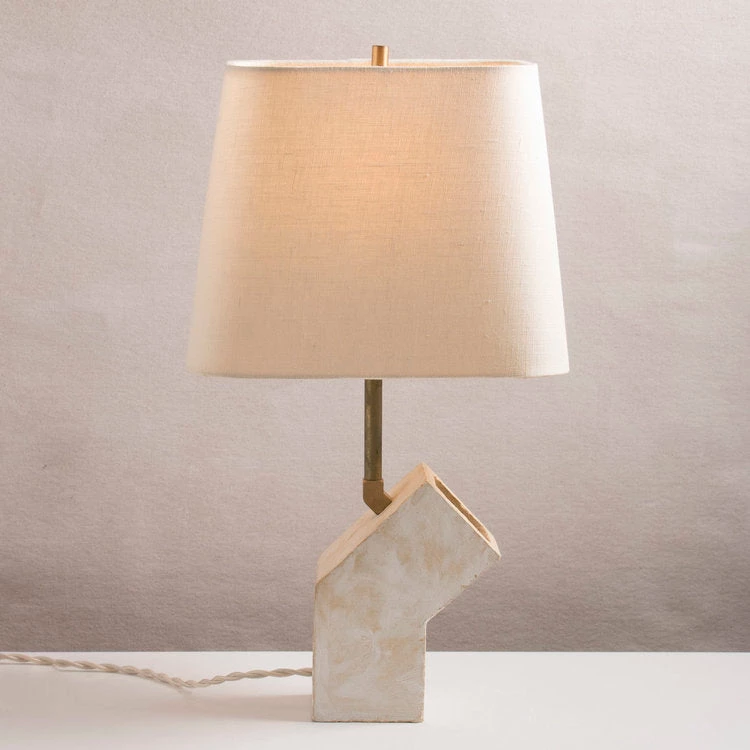 The Conduit Small Table Lamp features a whitewashed stoneware base with unfinished brass hardware. Ivory fabric-covered cord with inline switch is positioned at back of the base with lamp angle facing in either a right or left direction. Includes beige linen shade. Requires one standard-base bulb. Designed by John Sheppard. Made in New York.