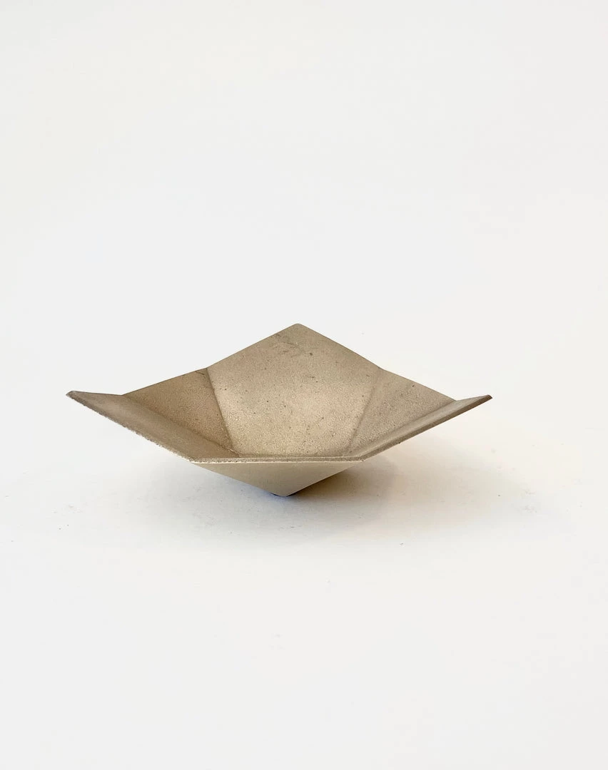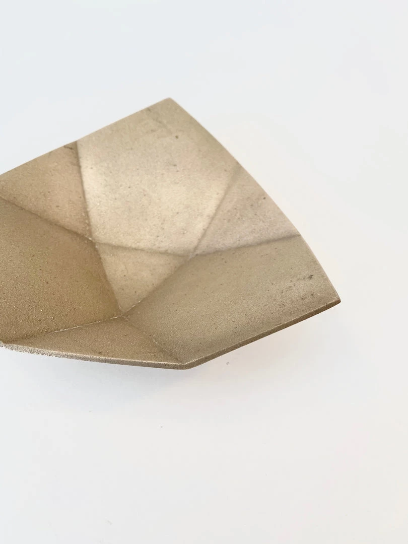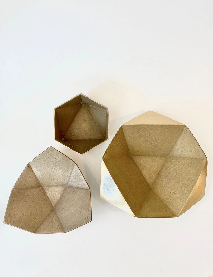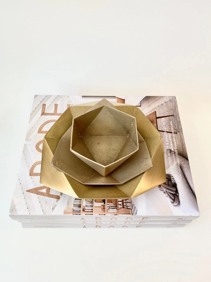 Incredible faceted Origami Bowls made from solid cast brass. Satin finished exterior with natural matte texture interior. Perfect objet for keys or business cards. Rubber feet to protect soft surfaces.
