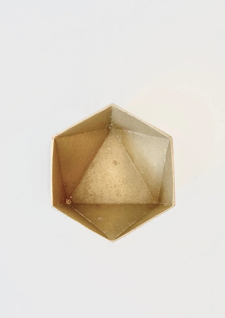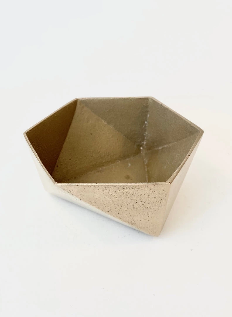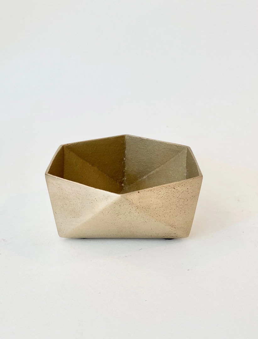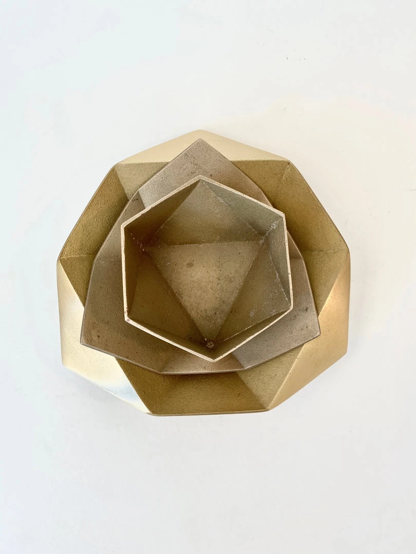 Incredible faceted Origami Bowls made from solid cast brass. Satin finished exterior with natural matte texture interior. Perfect objet for keys or business cards. Rubber feet to protect soft surfaces.