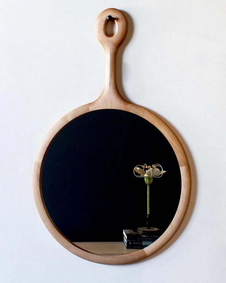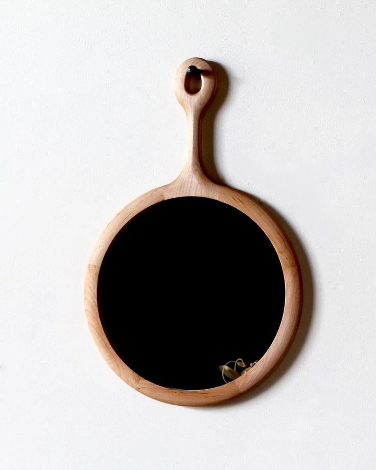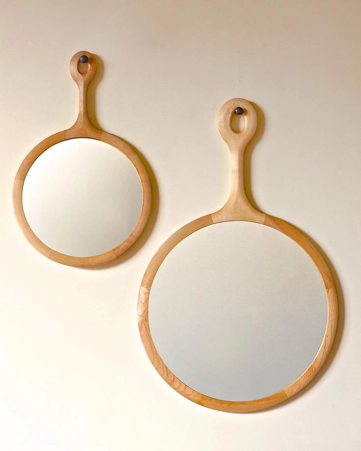 The Sophia Mirror is hand crafted from maple wood in Pennsylvania. The long neck of the frame is held by a hand hammered iron peg that will ship with the mirror. The large is a great scale for over a single sink in a powder room or above a console in an entryway. The medium is lovely size above a dresser or in a hallway.