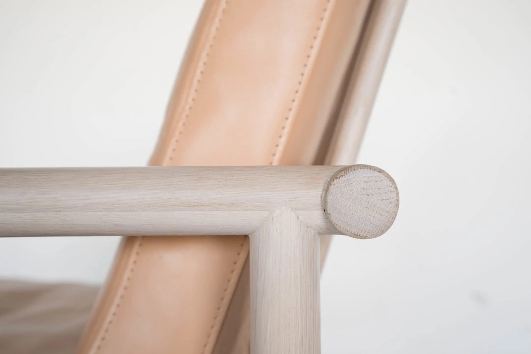Beautifully made white washed solid oak and nude leather lounge chair. The chair frame is made with traditional joinery without any metal screws or nails. The nude leather cushions are loose and will patina over time.