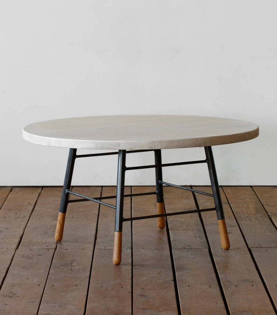 The Gordon Coffee Table is a nice size round wooden coffee table with a metal ladder style base and wooden peg feet. Made in USA of solid white oak which is then finished with a washed white stain or a dark washed stain. The simple, handsome design makes it a perfect fit for any living room decor from traditional to mid-century to modern farmhouse. We embrace the use of organic material and all of its qualities, so there may be variance in color and grain depending on the heartwood and sapwood makeup of each unique table top.
