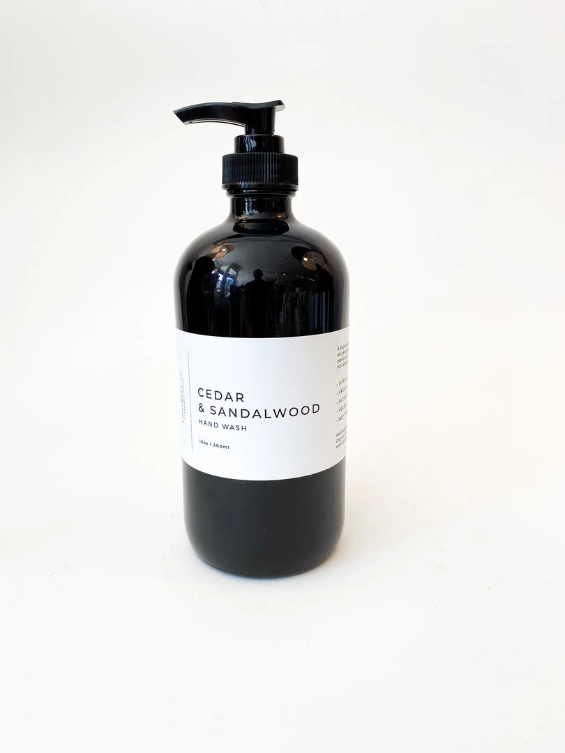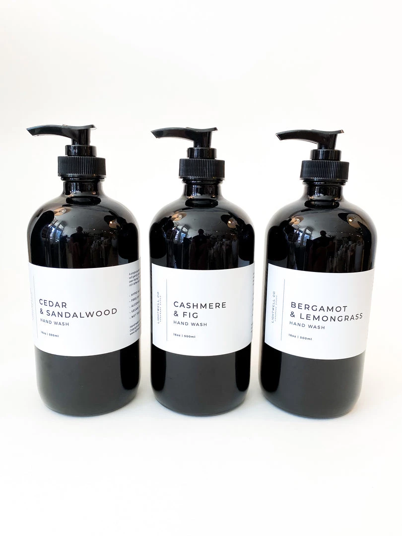 A single pump of our lathering hand wash will gently cleanse your hands without over-drying and stripping them of their natural oils. It comes in a black glass round bottle wrapped with a waterproof minimalist label.Â