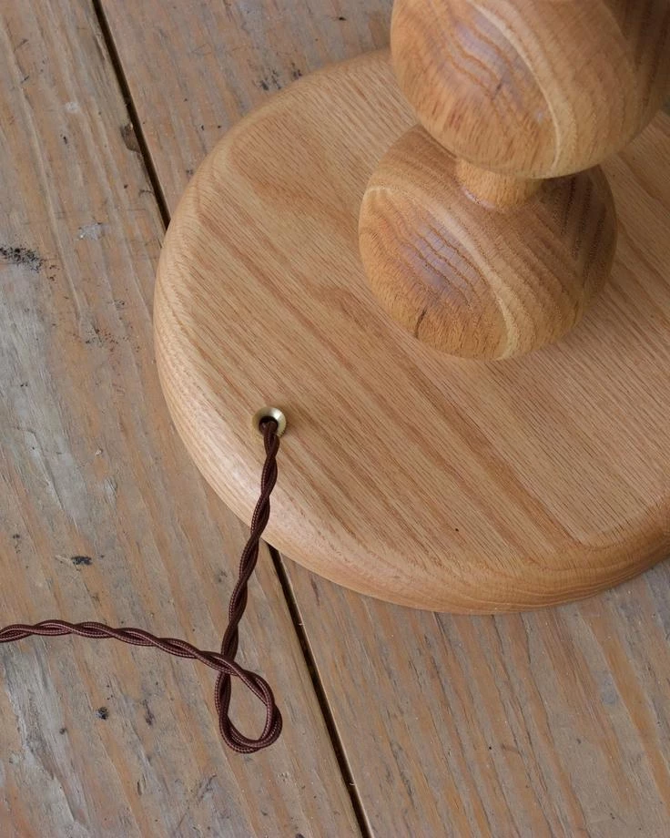 The Hugo Barbell Floor Lamp adds texture to any room of the house with its unique sculptural design. The lamp is handmade from solid oak, with cork fitted to the base to prevent any surface scratching. Choose a fabric shade in black or ivory. Made in the USA.