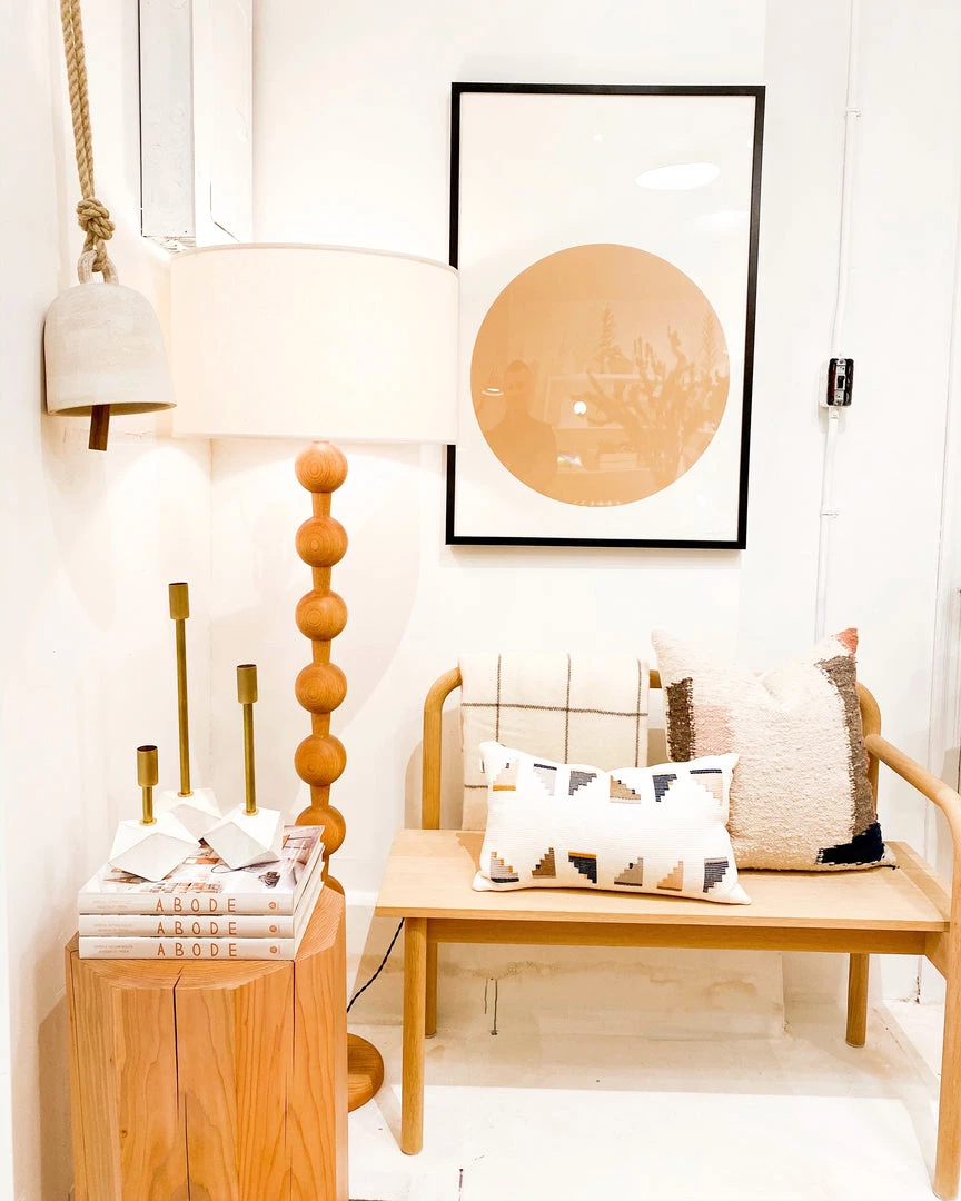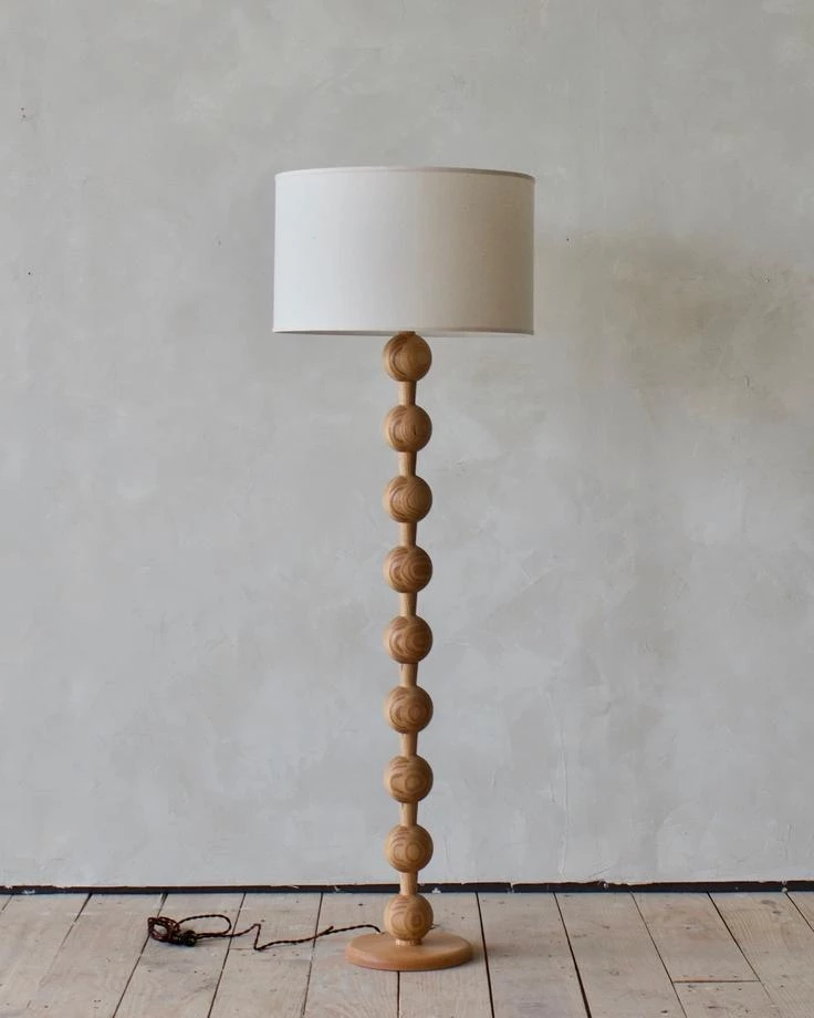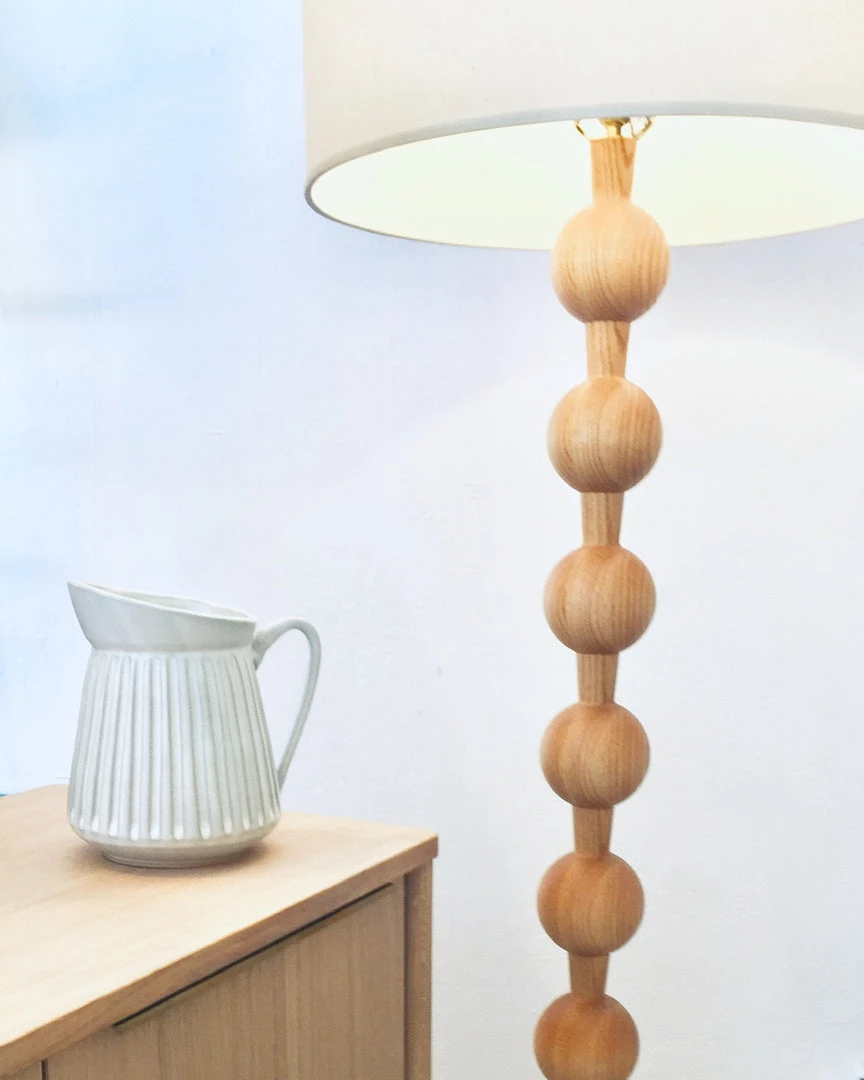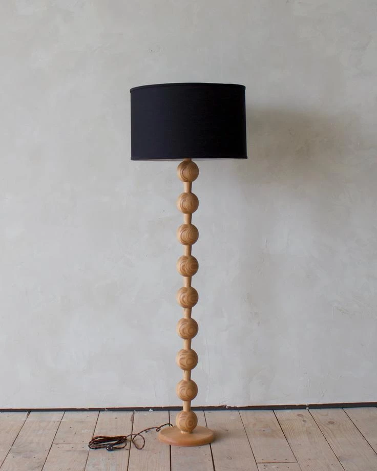 The Hugo Barbell Floor Lamp adds texture to any room of the house with its unique sculptural design. The lamp is handmade from solid oak, with cork fitted to the base to prevent any surface scratching. Choose a fabric shade in black or ivory. Made in the USA.