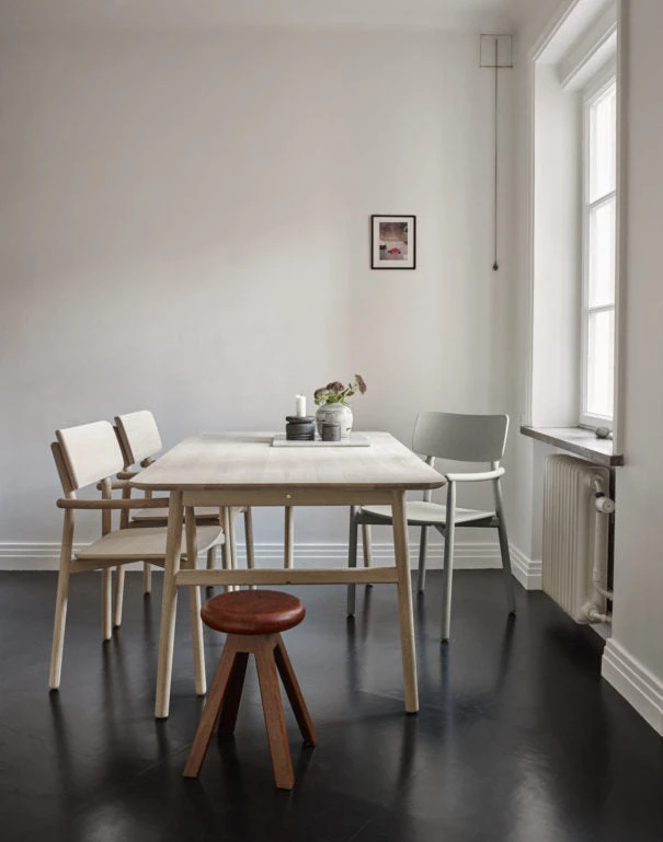 An embracing and comfortable armchair designed to support happy moments around the dining table. The Hven Armchair carries a light expression highlighted by few subtle details such as the overlapping poles, round corners and curved shape. Comes in natural untreated oak or painted oak in light gray or dark blue. Designed by Anton Björsing / Skagerak Denmark.
