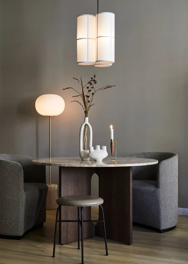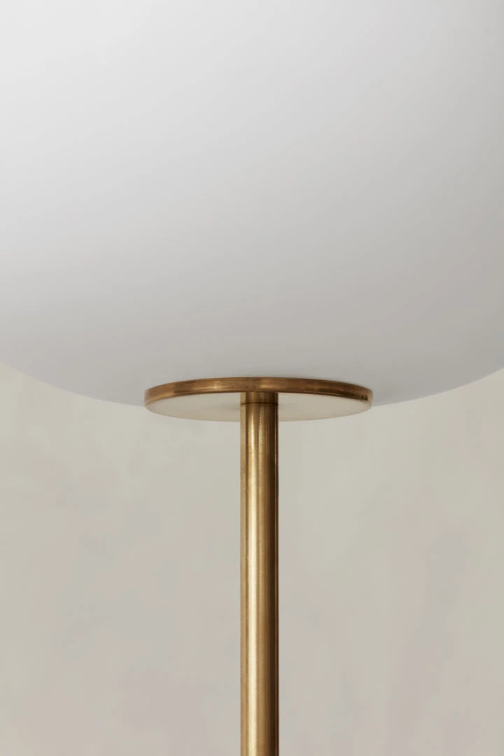 Pared back to its purest form, this floor lamp is a study in the contrasts of natural materials: set on a substantial marble base, rounded at the edges for a soft expression, the elegant tubular metal stem – available in brushed or bronzed solid brass – holds an elliptical opal glass shade that emits a soft, ambient light.