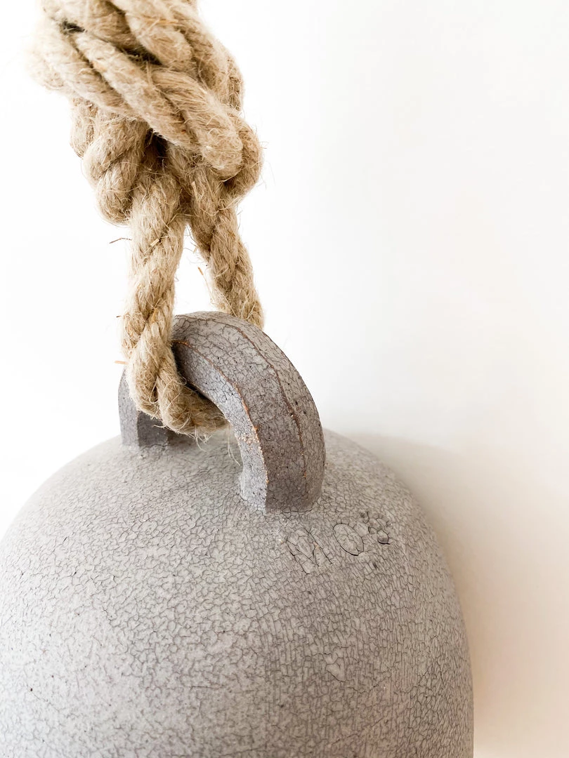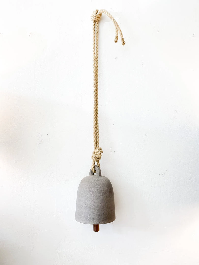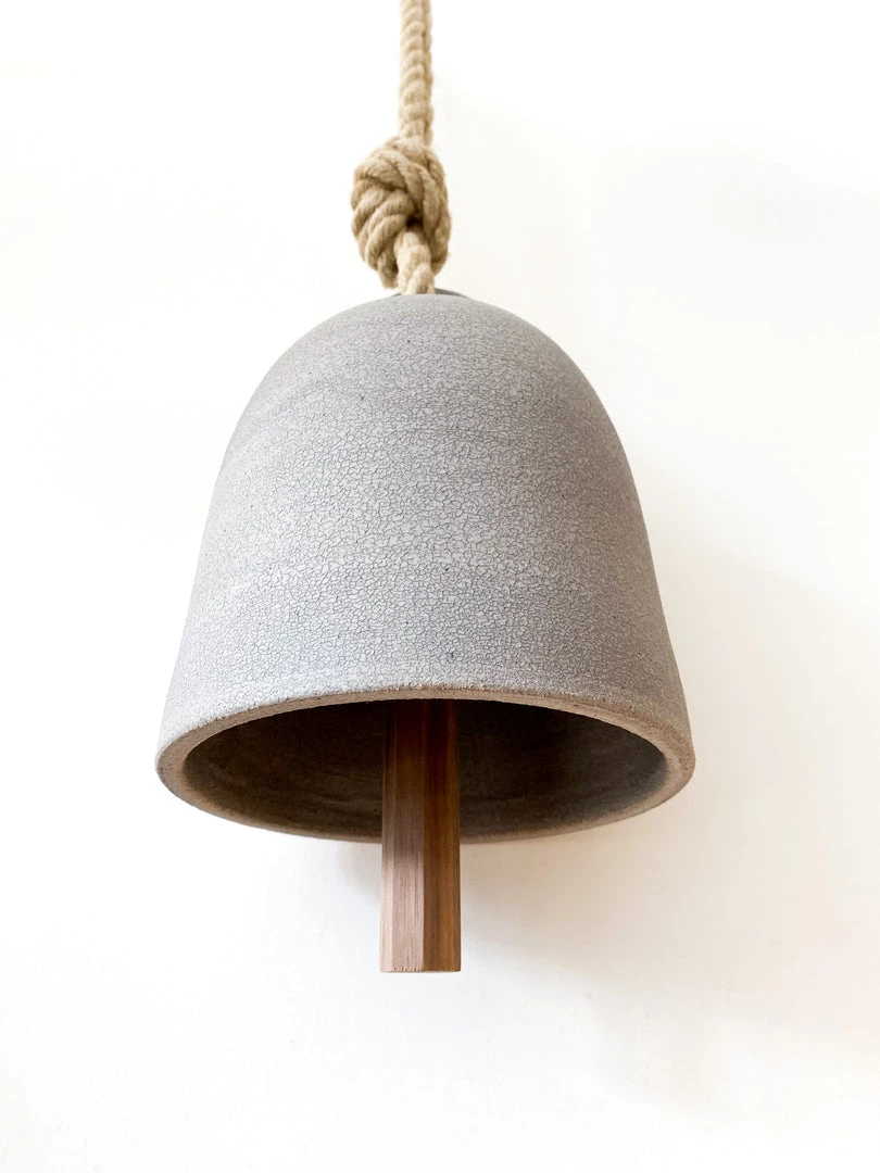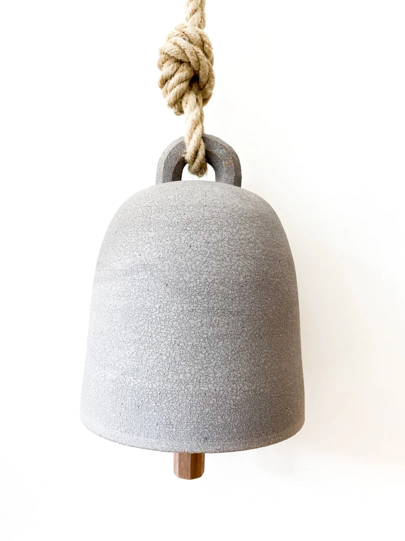 Large ceramic hanging bell in matte grey pottery. Solid walnut clapper hanging from internal center of bell.