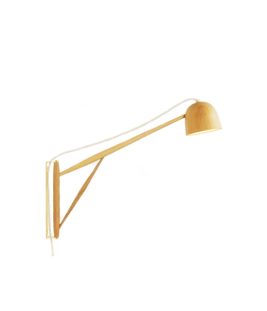 Wood, cotton cloth-covered cord, LED light bulb.