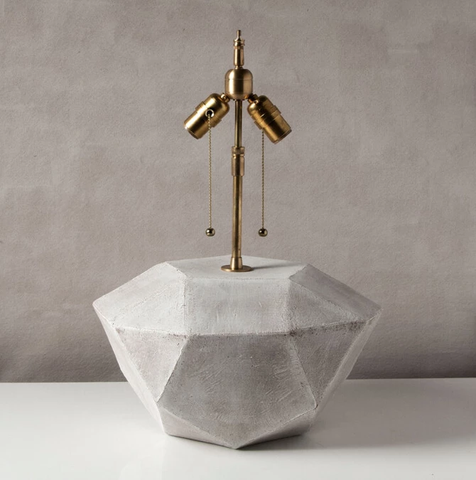 This dramatic ceramic and brass table lamp combines clean geometric lines with the warmth and individuality inherent in handmade work. Each base is assembled individually from flat sheets of a rich red-brown stoneware, into a complex geometric shape that feels both natural and entirely modern. Unfinished brass hardware includes two pull-chain sockets on a height-adjustable stem.