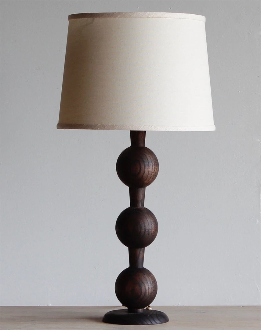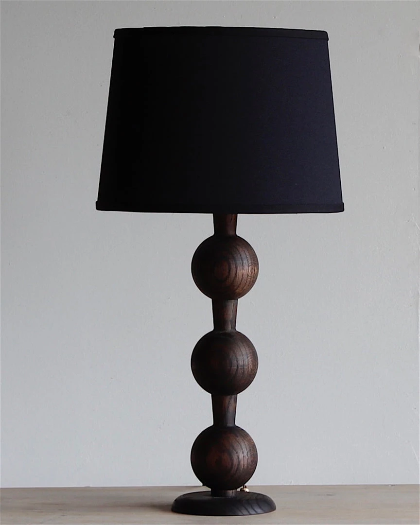 The Hugo Barbell Table Lamp is a hand-made, wooden accent piece befitting of any living or bedroom. Made in solid oak with a cork bottom fitted to the base to protect surfaces. The lamp cord is a decorative brown twisted cloth wire and the plug is a round plug inspired by vintage bakelite. Choose a tapered fabric shade in black or ivory. Made in the USA.
