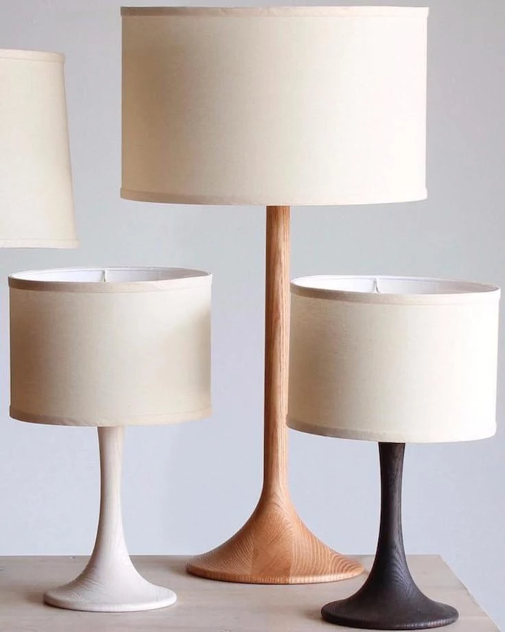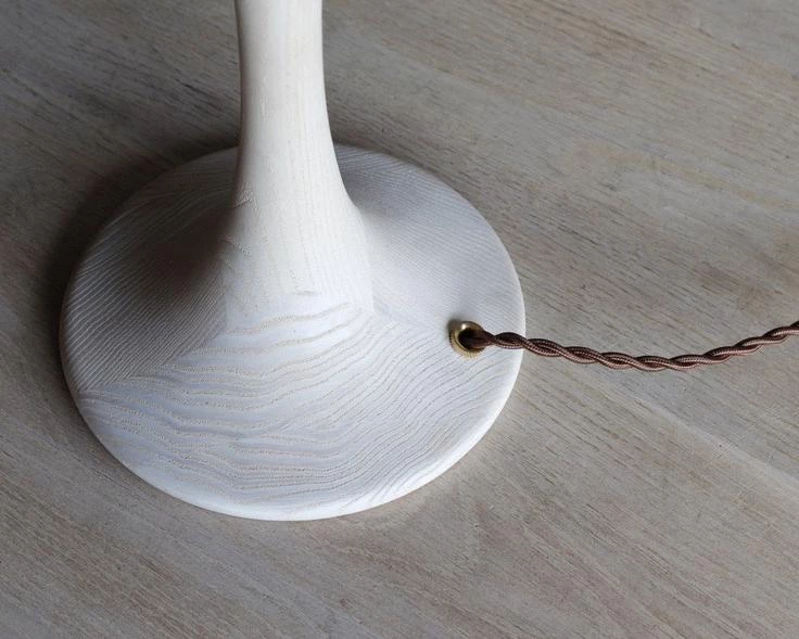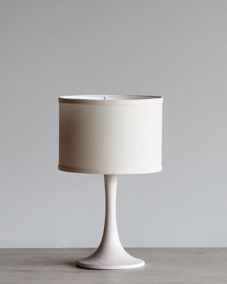 The Small Trumpet Lamp is ideal for a tight space like an office nook in the kitchen, or a dressing vanity top. The lamp is handmade from solid oak, with cork fitted to the base to prevent any surface scratching. The lamp features a decorative brown twisted cloth wire cord with a round Bakelite vintage inspired plug. Choose a fabric shade in black or ivory. Made in the USA.