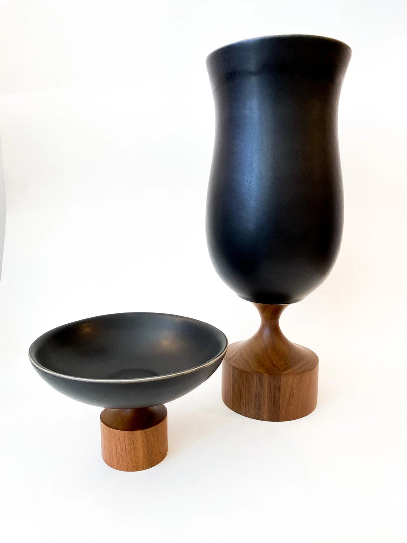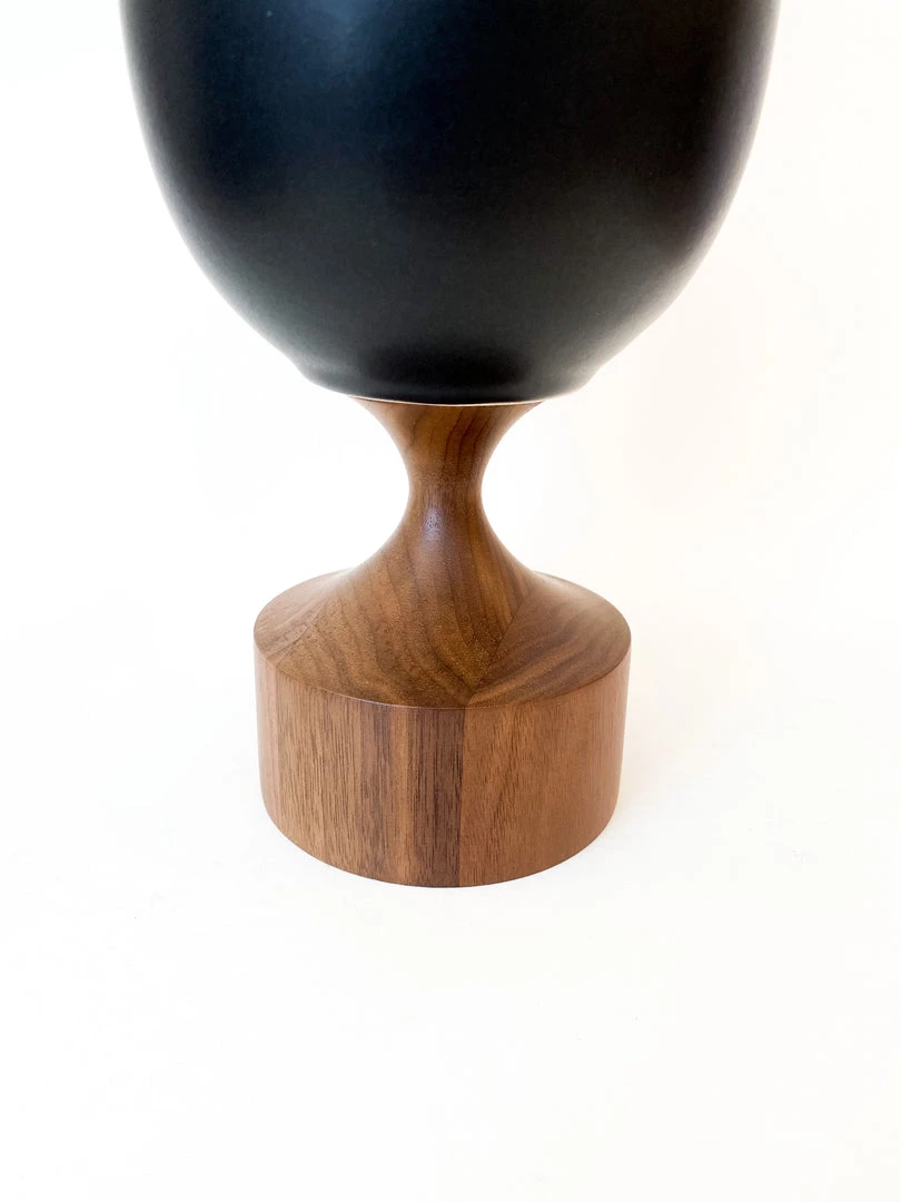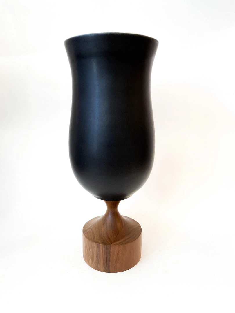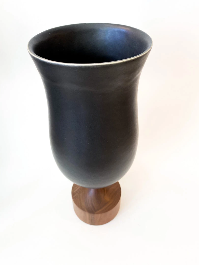 Walnut and porcelain come together to create this elemental beauty – The Miss Jean vase. Sensually glazed porcelain bowl perches on a base of warm, hand-turned, solid walnut.