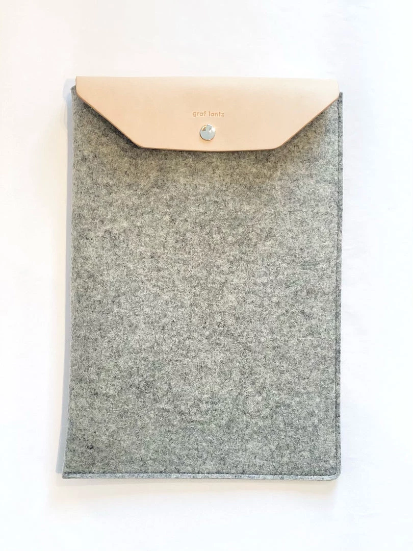 A merino wool felt body with a leather flap that gently snaps shut to snugly fit your MacBook Air or Pro.