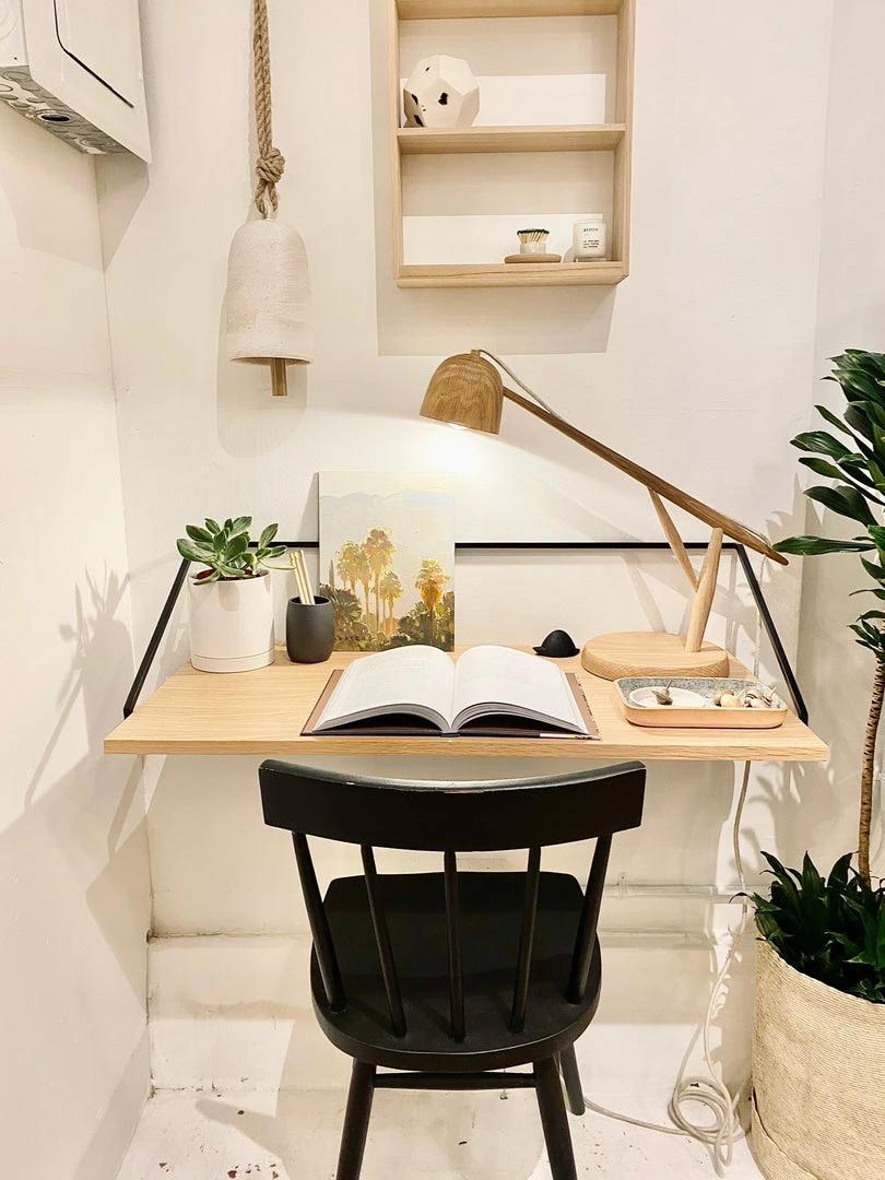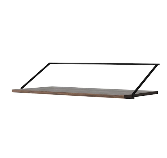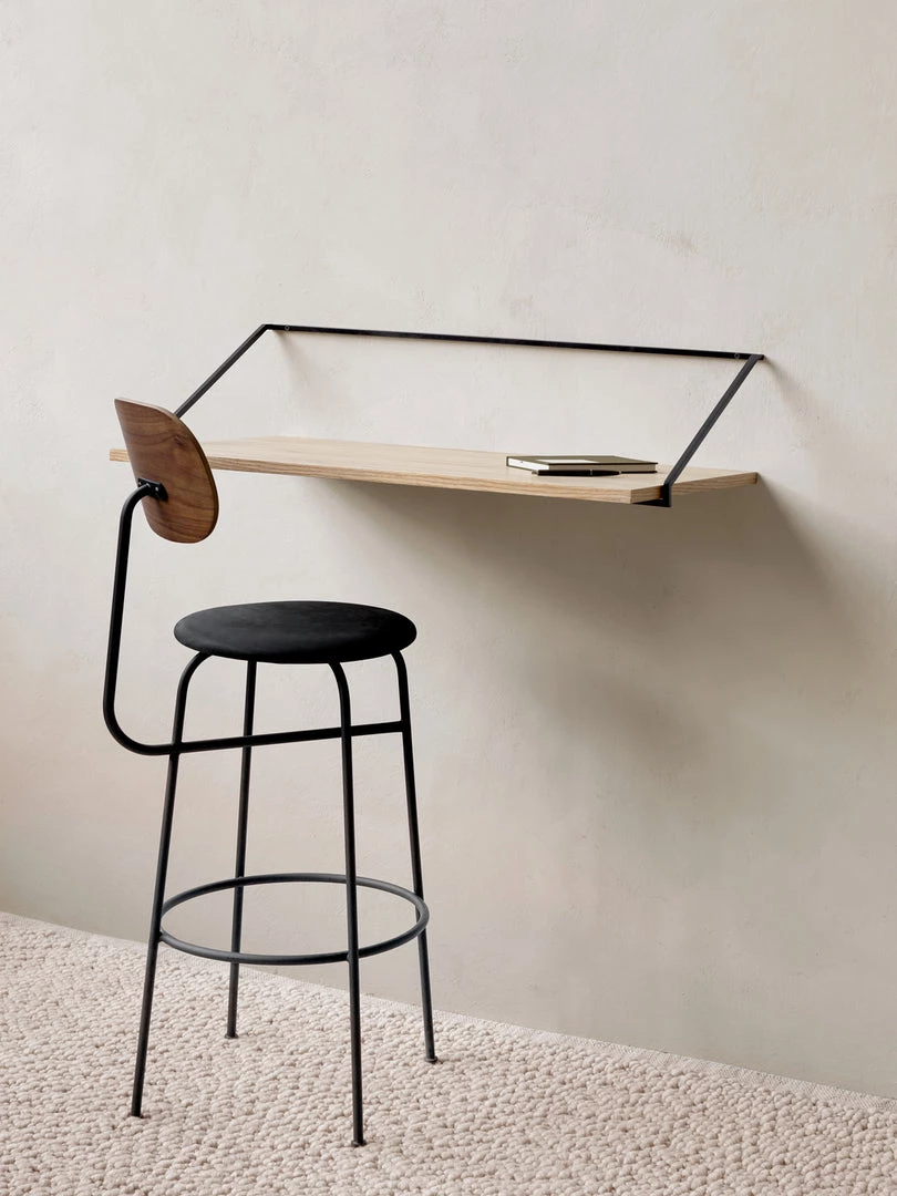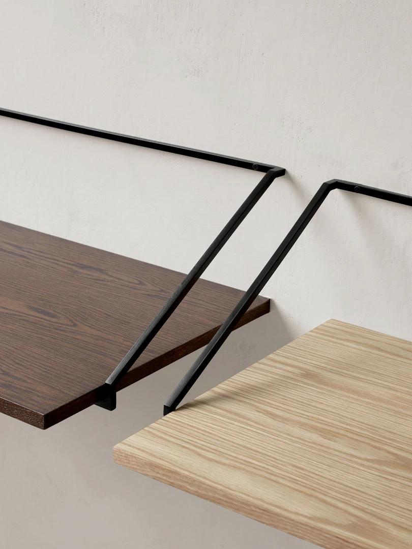 With multiple functions – as a desk, counter or shelf to store books, hung at any height you choose – it lends itself to almost any setting and fits neatly into living areas as well as bedrooms where space is at a premium. The minimalist steel bracket attaches to a wall and takes its cues from the handrail of a staircase. The wooden platform, available in natural or stained oak, provides a tactile contrast to the precision metalwork.