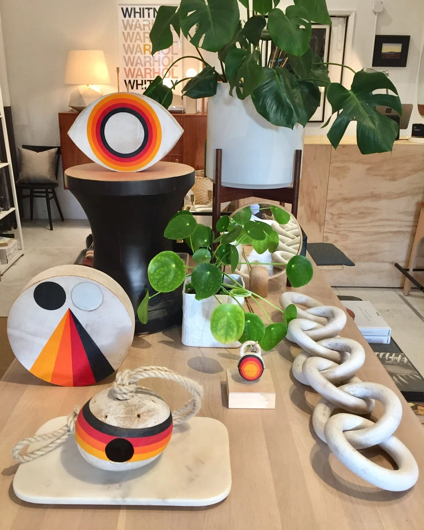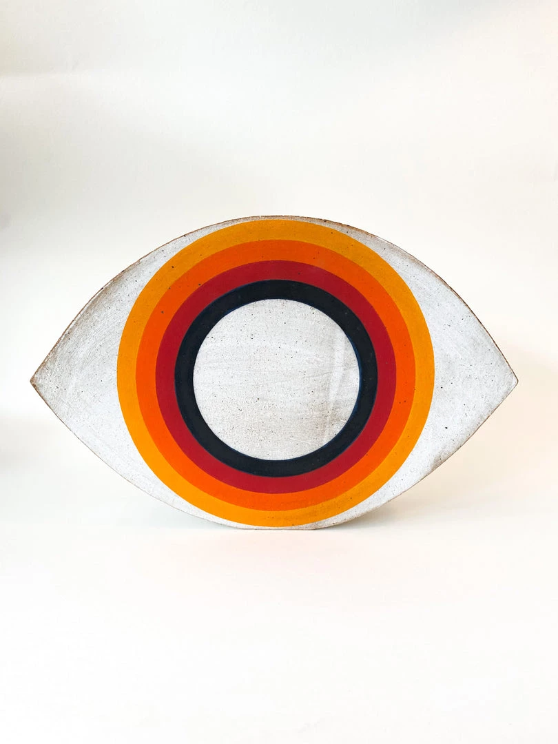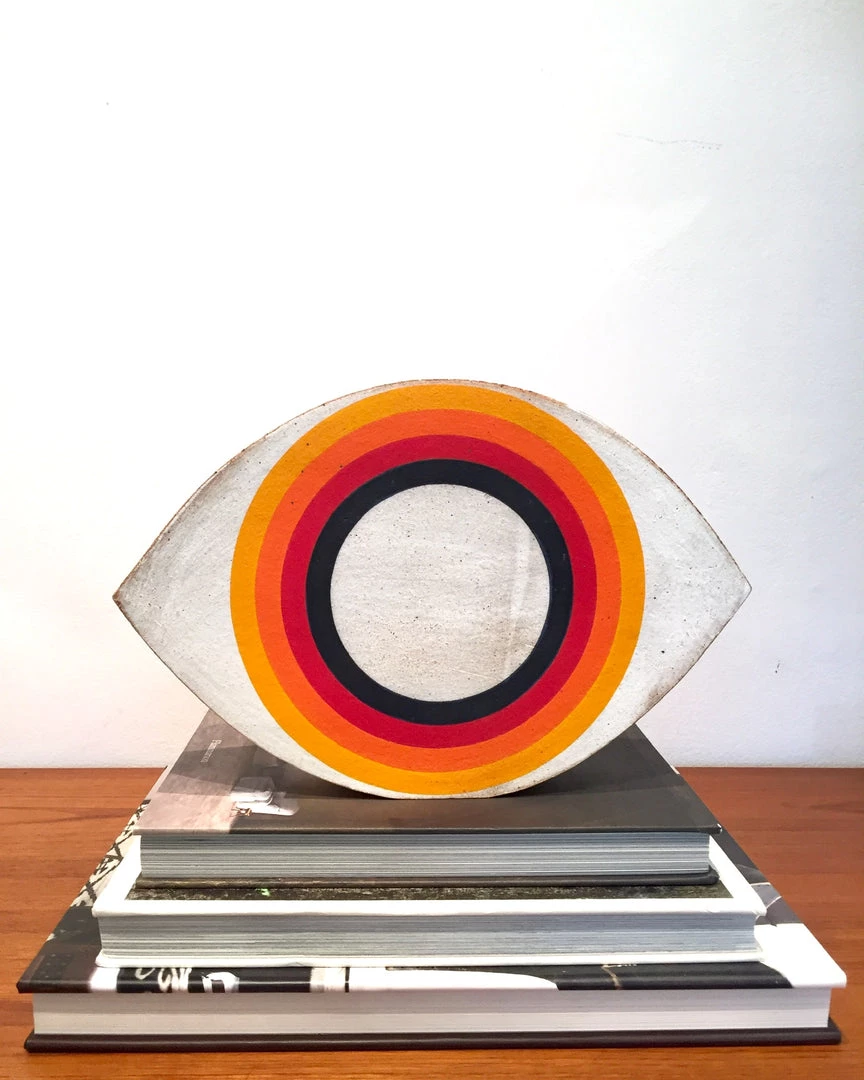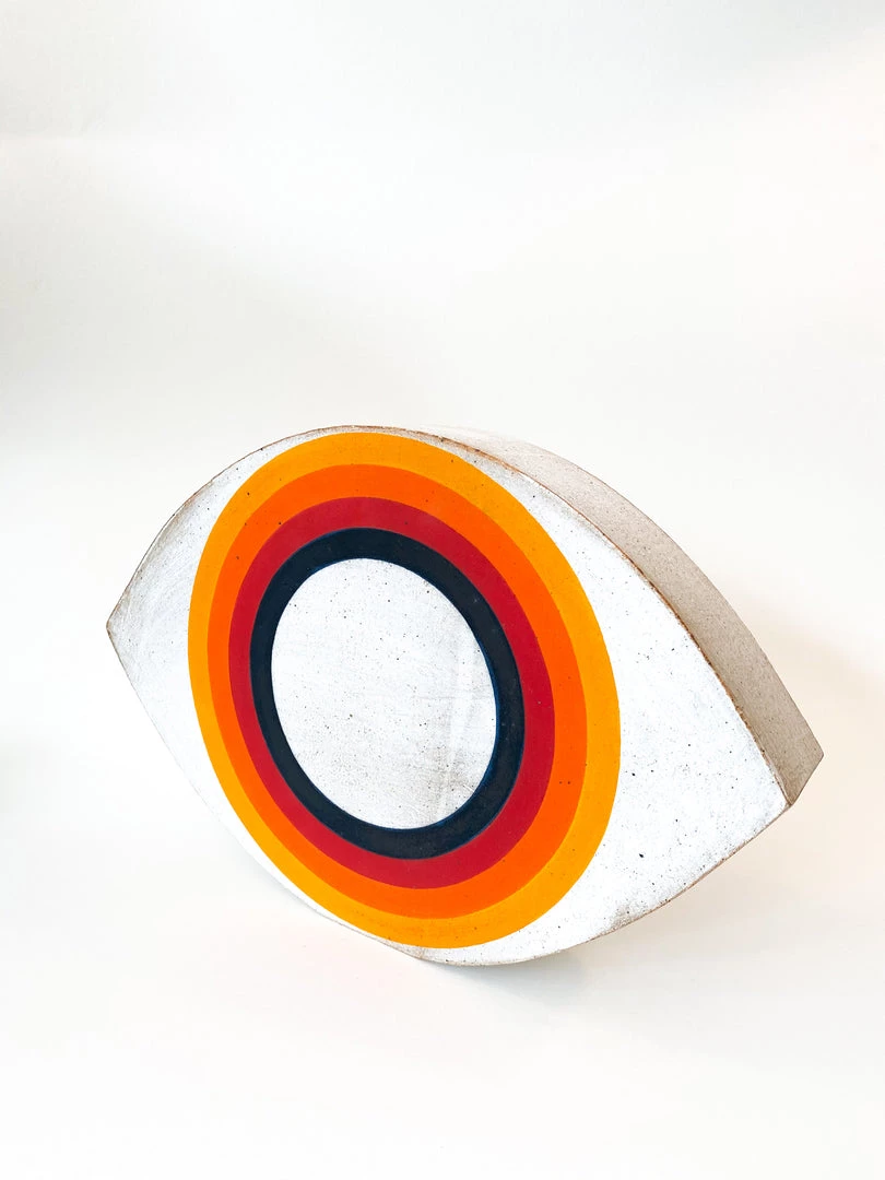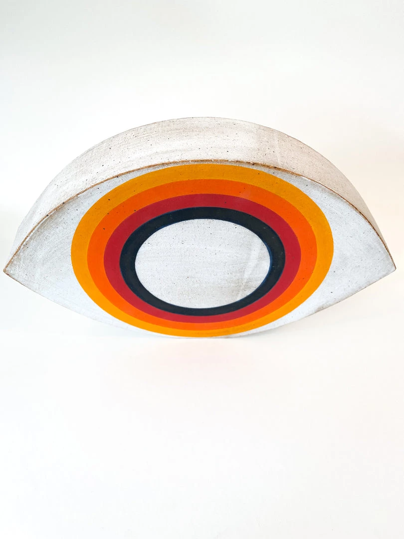 Hand built stoneware eye object is painted with Rainbow motif.