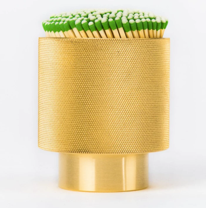 Machined of solid brass, this scratcher is a vertical cylinder with a complete knurled face for striking phosphorus tipped “Strike Anywhere” kitchen matches. The striking surface will mark with each strike, adding your own history of use to the piece. The flat top and bottom surfaces may be polished as you would with any other brass item. Do not expose to water, as this will tarnish the brass.