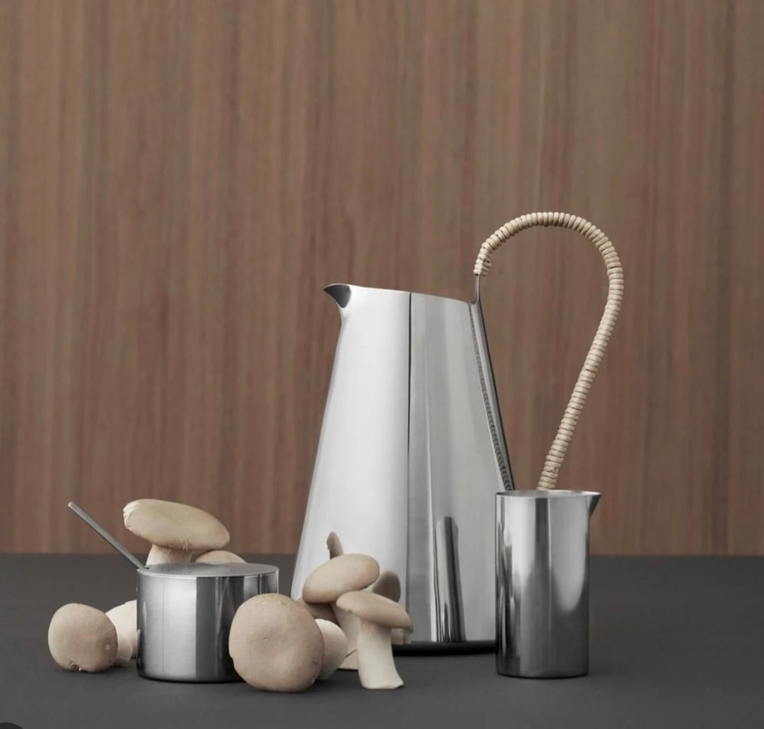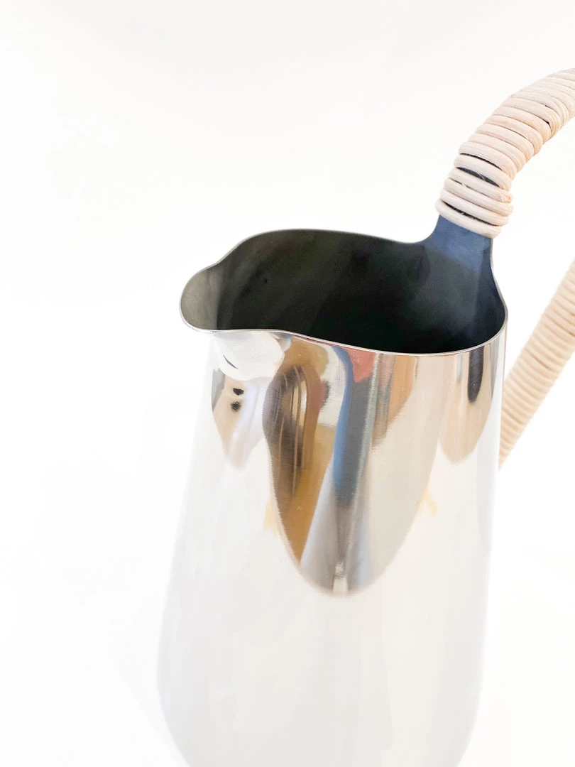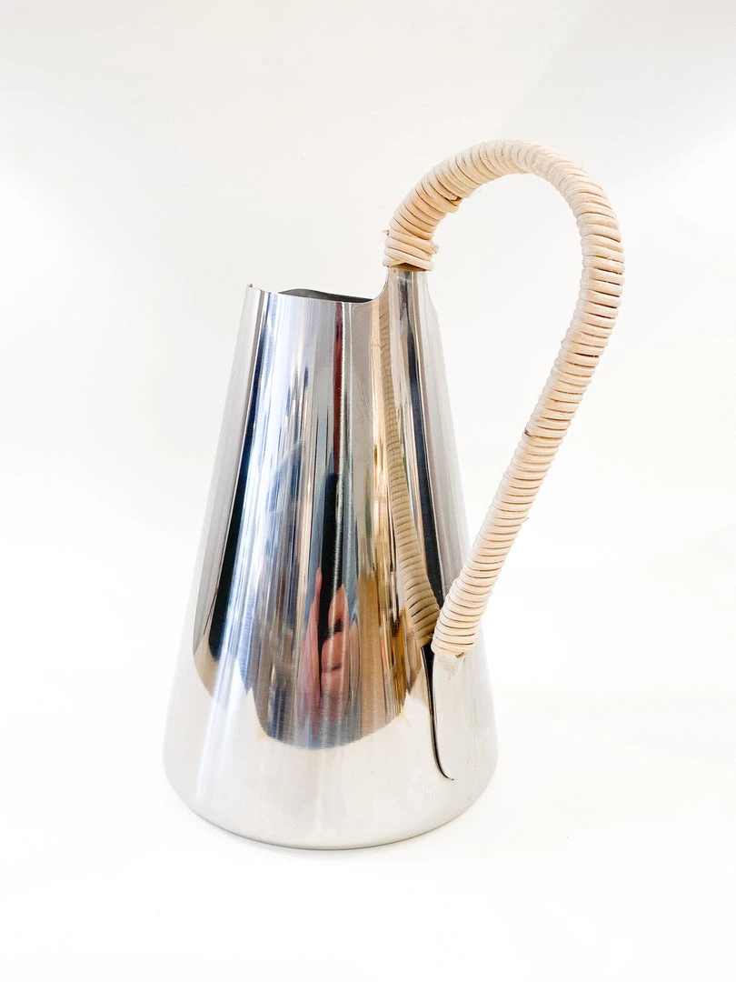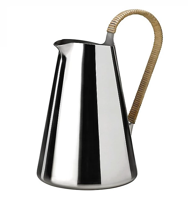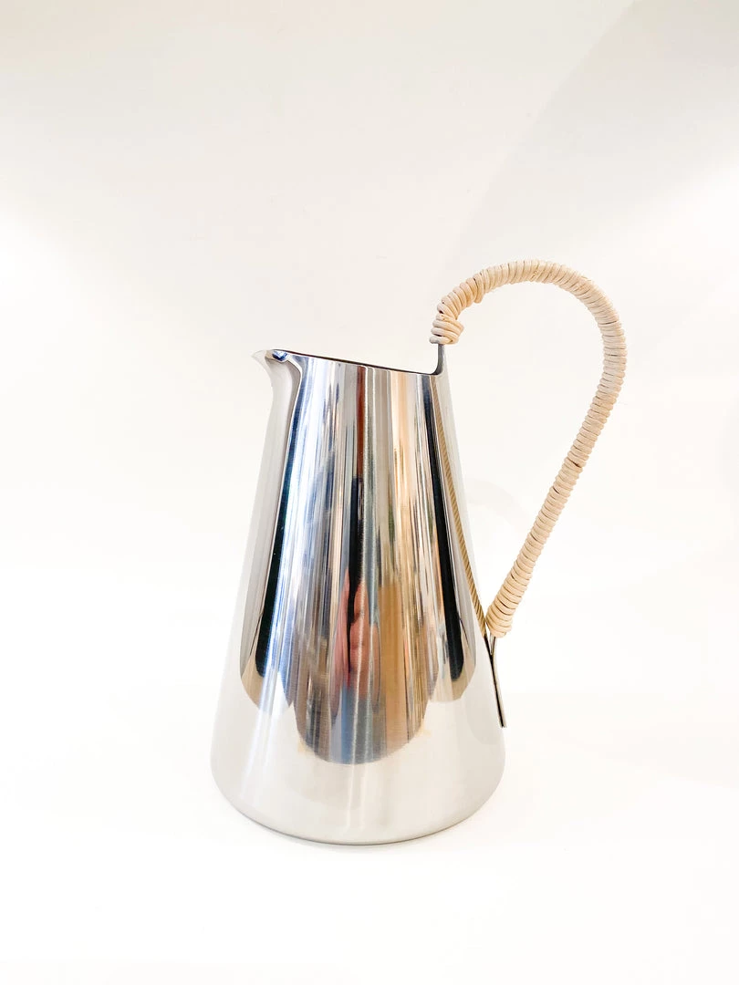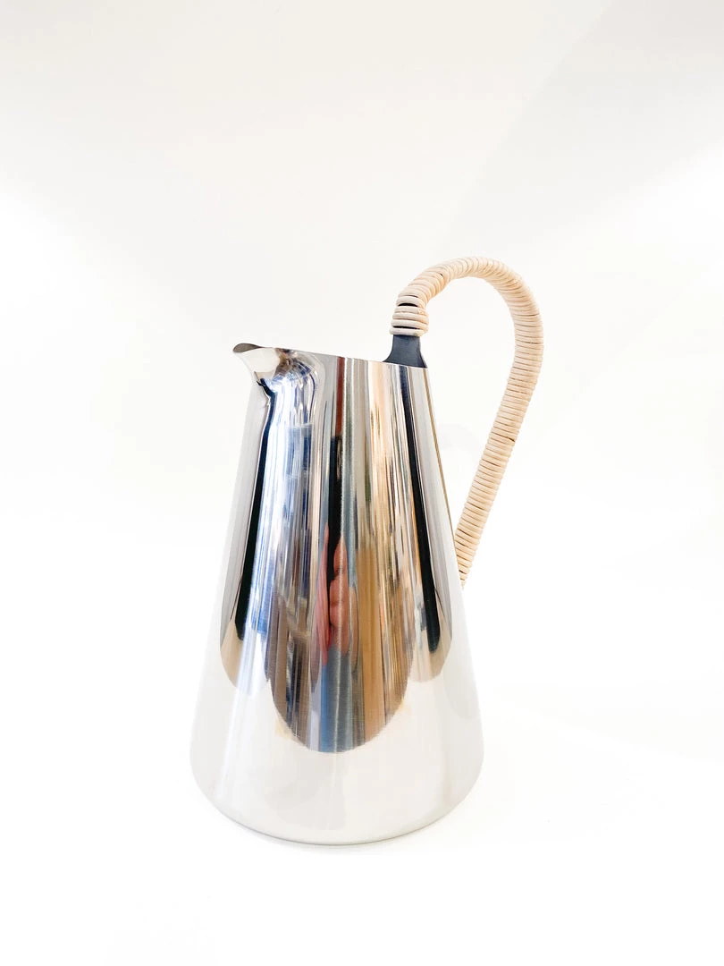 Beautifully designed water pitcher made of stainless steel with a rattan wrapped handle. Designed by Klaus Rath for Stelton Denmark.