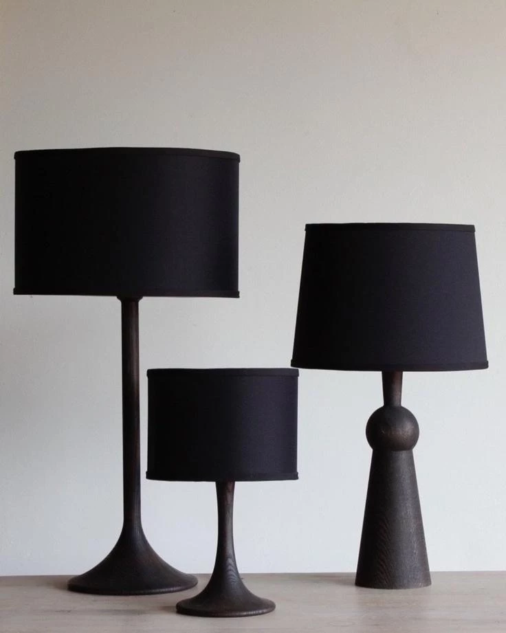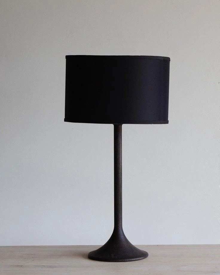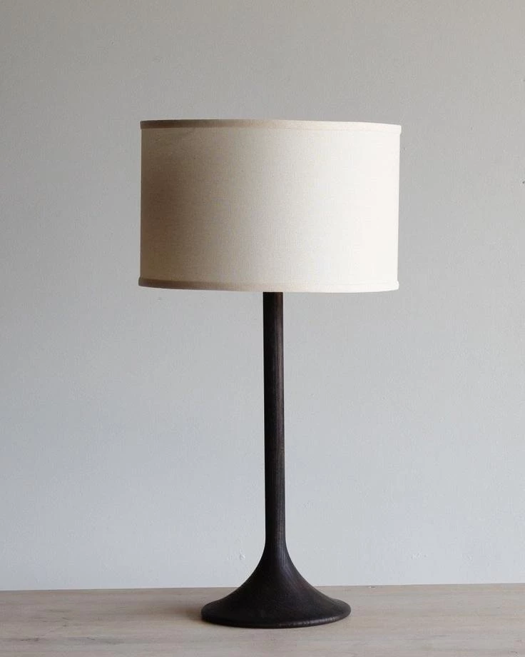 With its minimal yet sophisticated look, the Trumpet table lamp is a versatile piece for your living room, end table or credenza. The lamp is handmade from solid oak, with cork fitted to the base to prevent any surface scratching. The lamp features a decorative brown twisted cloth wire cord with a round Bakelite vintage inspired plug. Choose a fabric shade in black or ivory. Made in the USA.