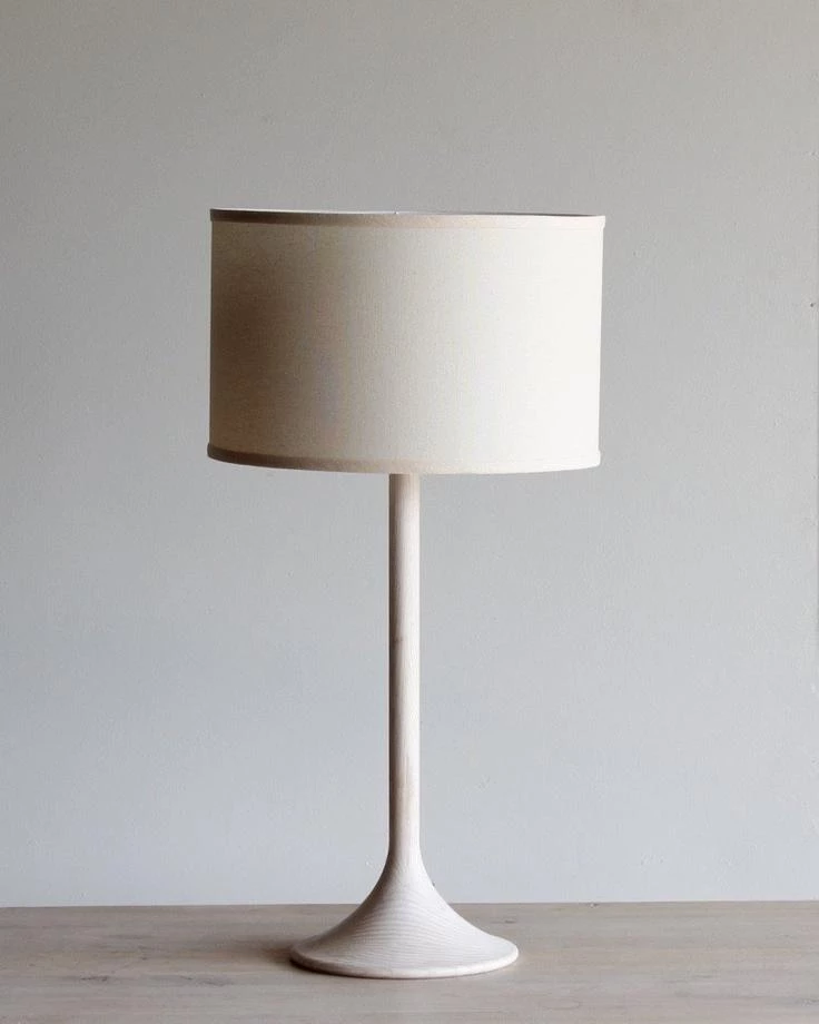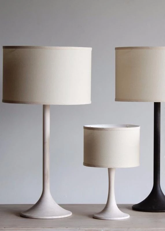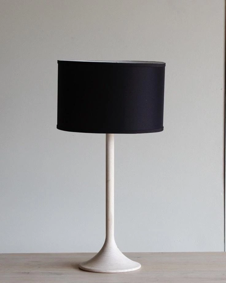 With its minimal yet sophisticated look, the Trumpet table lamp is a versatile piece for your living room, end table or credenza. The lamp is handmade from solid oak, with cork fitted to the base to prevent any surface scratching. The lamp features a decorative brown twisted cloth wire cord with a round Bakelite vintage inspired plug. Choose a fabric shade in black or ivory. Made in the USA.